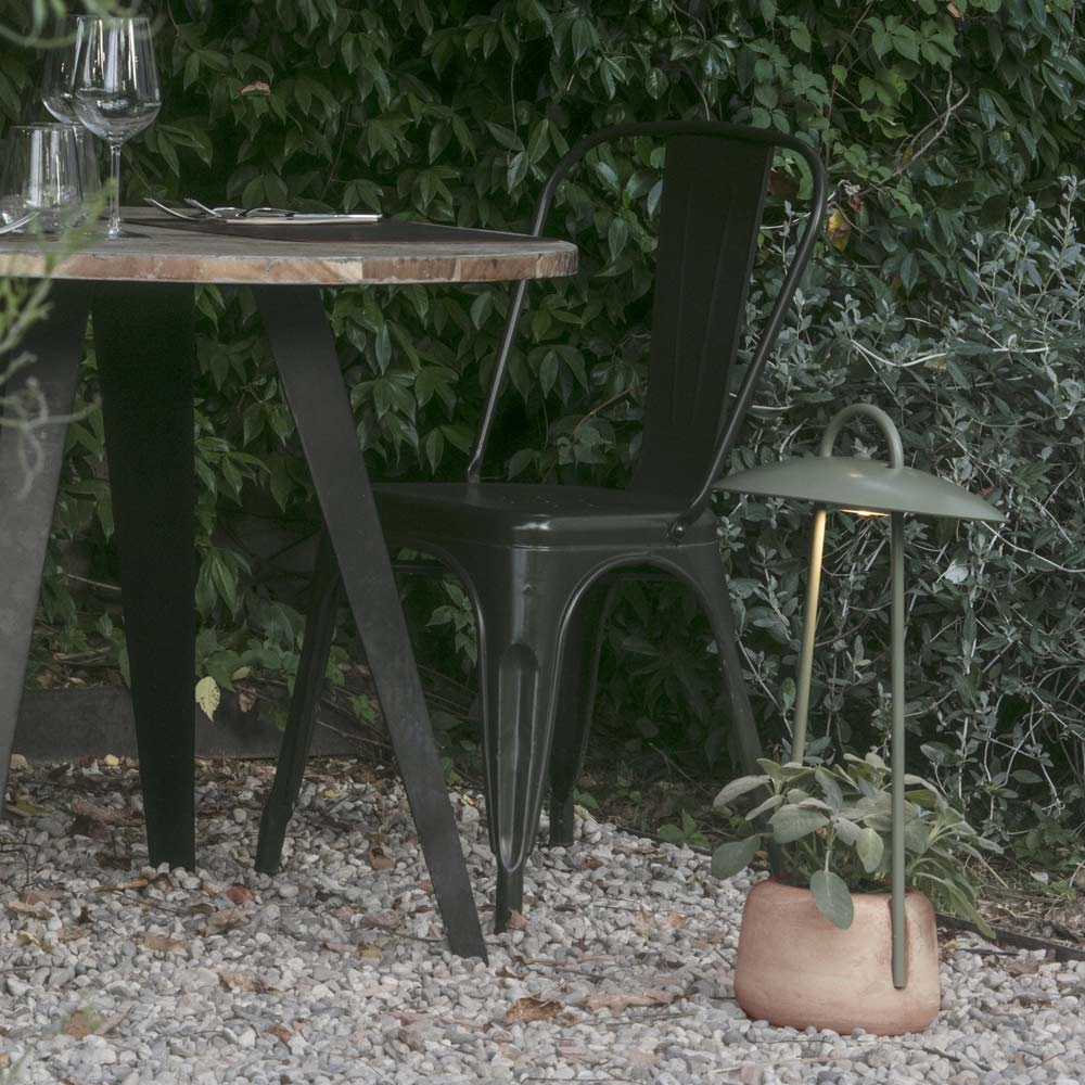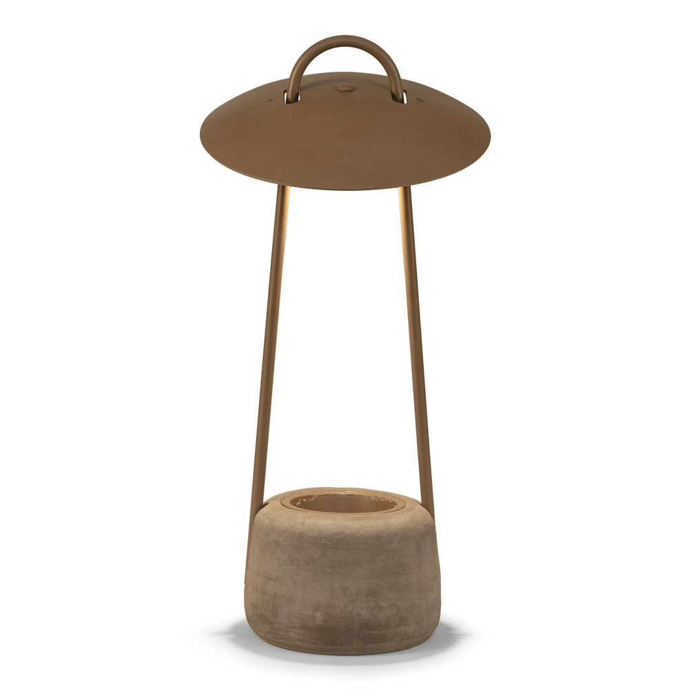 Den enkla men raffinerade designen, med en lerbas som fungerar som en vas, matchar perfekt den eleganta metallstrukturen som stödjer en minimalistisk lampskärm. Denna kombination lyser inte bara upp din miljö utan skapar också ett grönt hörn, perfekt för små växter eller aromatiska örter.