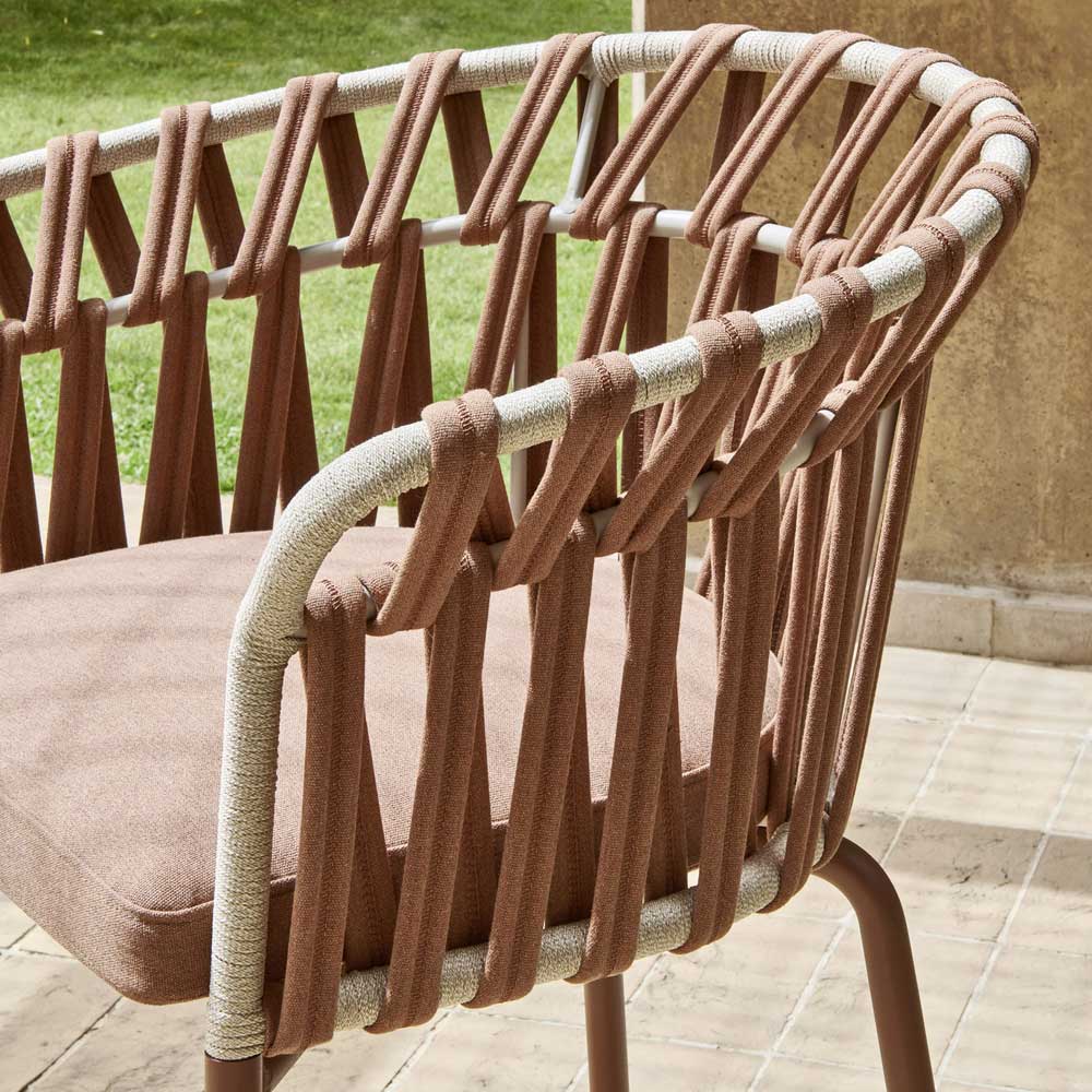 Trädgårdspall med aluminiumstruktur målad med epoxipulver i rostfinish, sits i rostfärgat avtagbart tyg och rygg i aluminium berikad med en sammanvävning av akryltygssnören i rostfinish, helt tillverkad i Italien . En innovativ och fräsch inredningslösning, idealisk för att tillfredsställa ögat tack vare sin eleganta och moderna estetik samtidigt som den erbjuder en välkomnande och särskilt bekväm sits .