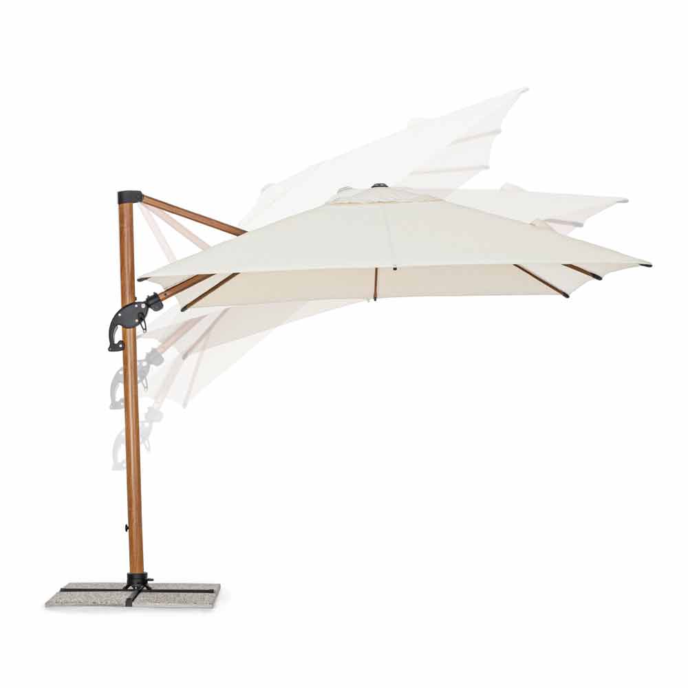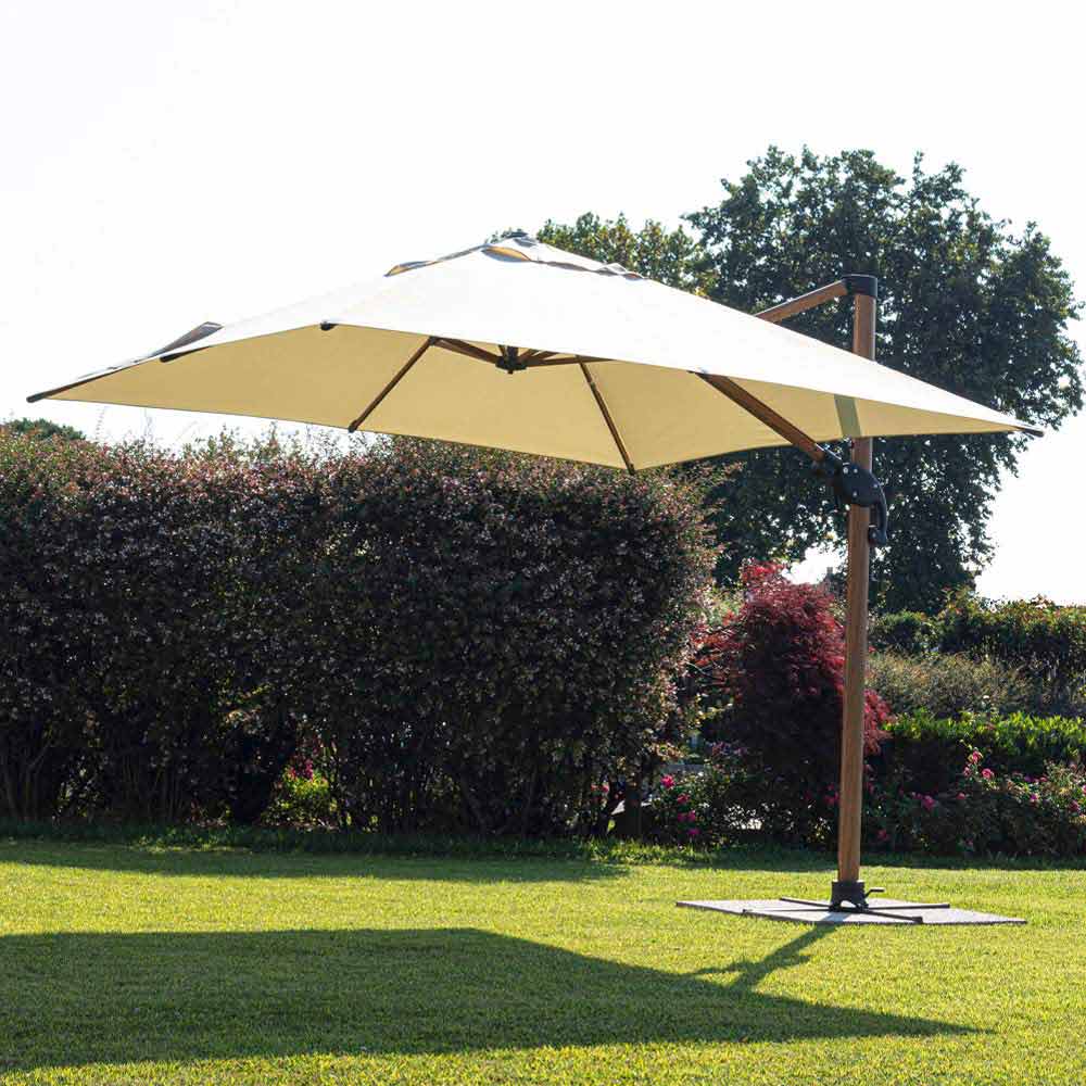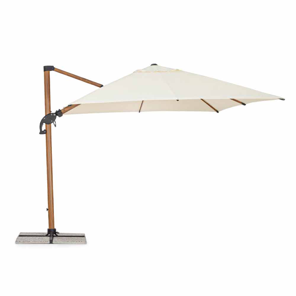 Pulverlackerad aluminiumstruktur (polyester) med träeffekt. 90x60mm stolpe, 8 25x17mm revben. Beige polyestertyg 250gr / m2 med pa (polyamid) -beläggning. Tvärfot i stål . 360 ° roterande stolpe med pedal. Vertikal lutning med 6-lägeshandtag. Utrustat med höger-vänster lutningssystem för paraply. Inklusive paraplyöverdrag.