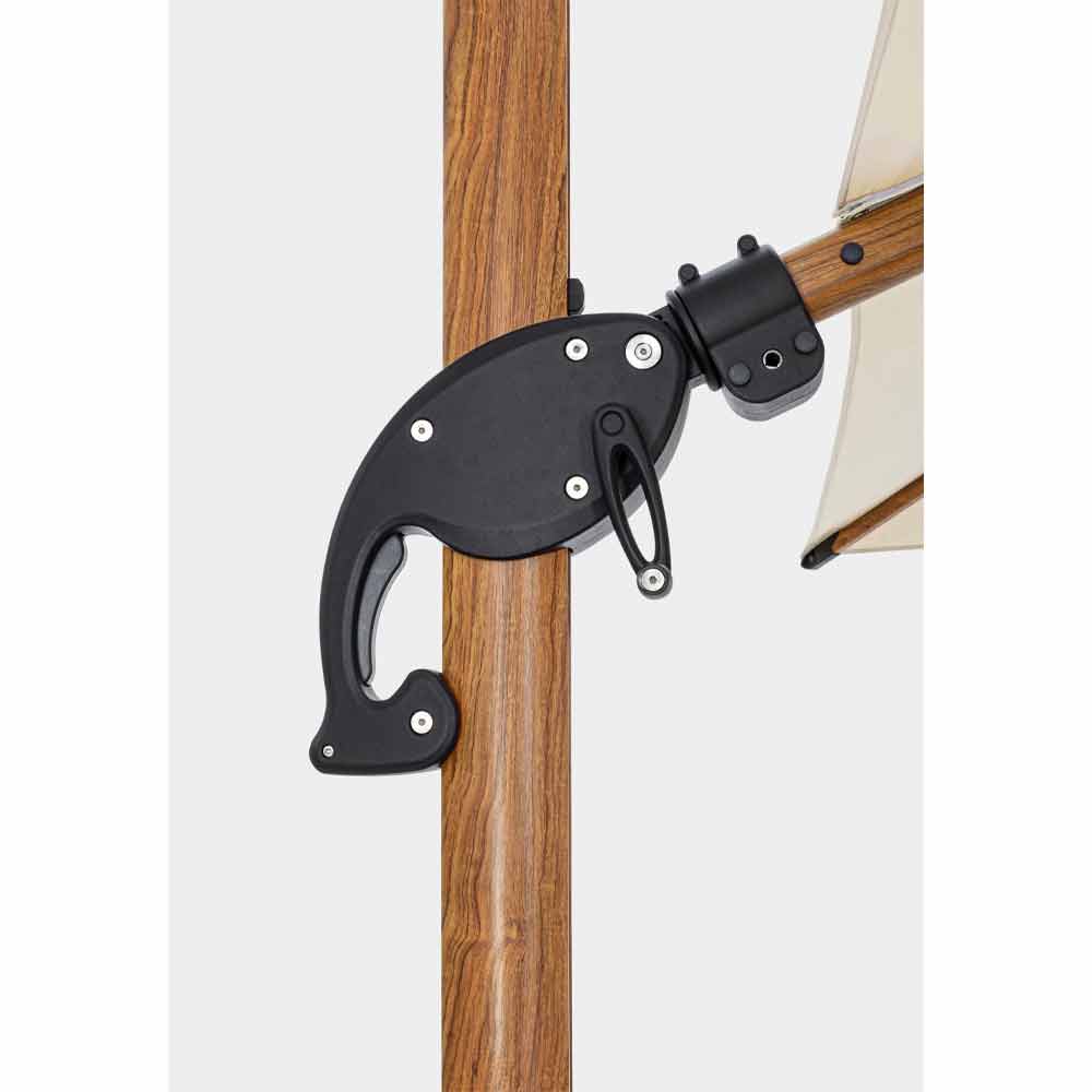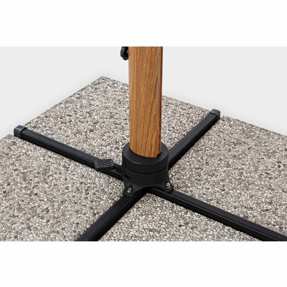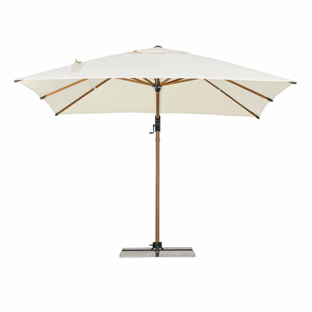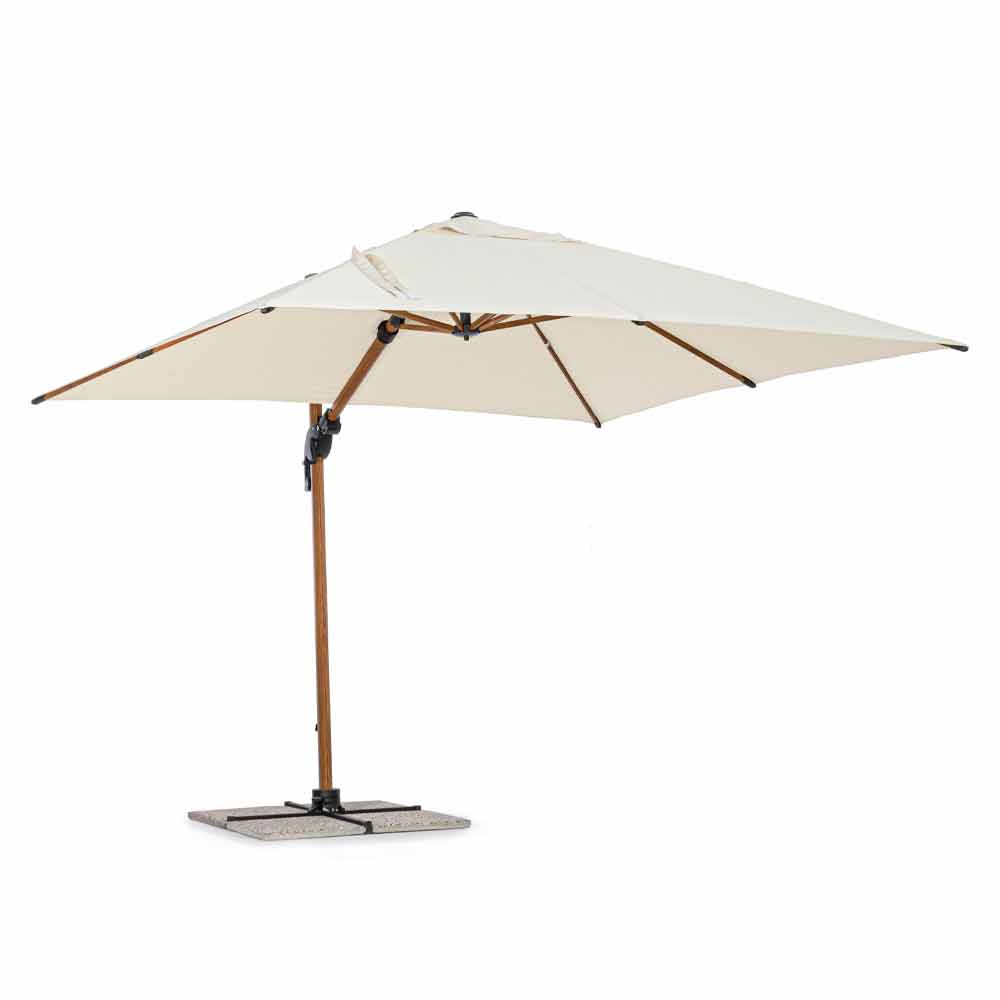 Pulverlackerad aluminiumstruktur (polyester) med träeffekt. 90x60mm stolpe, 8 25x17mm revben. Beige polyestertyg 250gr / m2 med pa (polyamid) -beläggning. Tvärfot i stål . 360 ° roterande stolpe med pedal. Vertikal lutning med 6-lägeshandtag. Utrustat med höger-vänster lutningssystem för paraply. Inklusive paraplyöverdrag.
