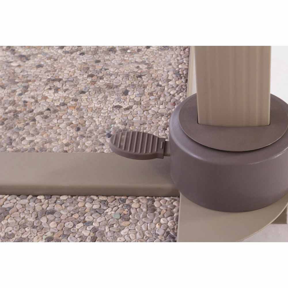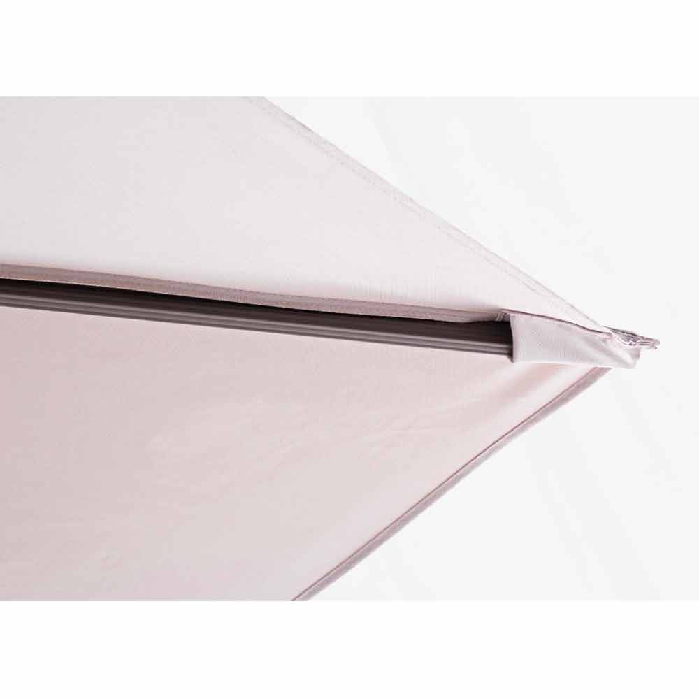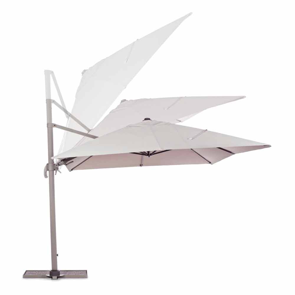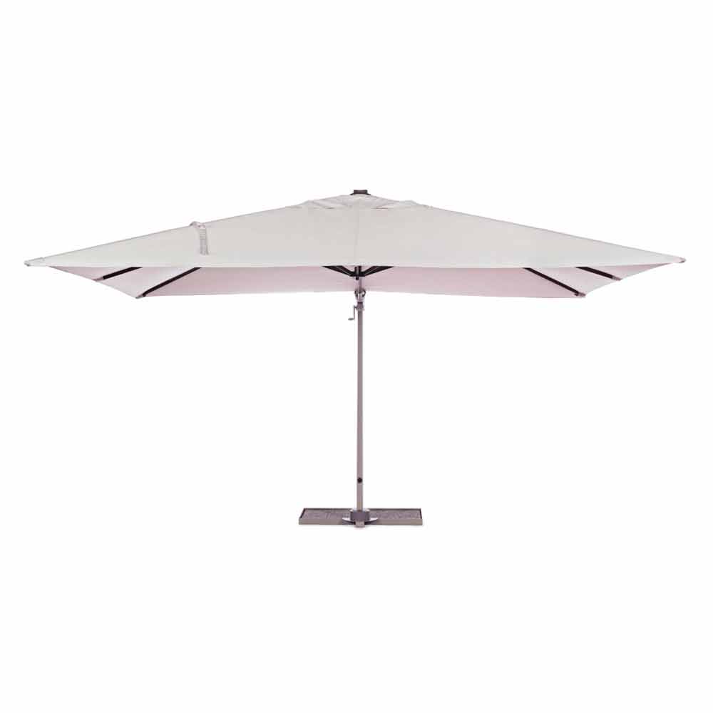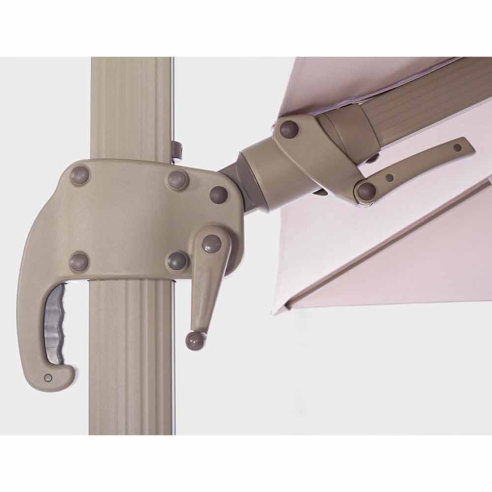 Pulverlackerad aluminiumstruktur (polyester). Pole 57x93x2mm, 8 revben 25x17x1mm. Sandfärgat polyesteröverdrag 250gr / m2 med pa (polyamid) -beläggning. Sidosockel i stål . Manuellt vridbar 360 ° stolpe. Vertikal lutning med 5-lägeshandtag. Utrustad med handtag för paraplyets höjning till vänster.