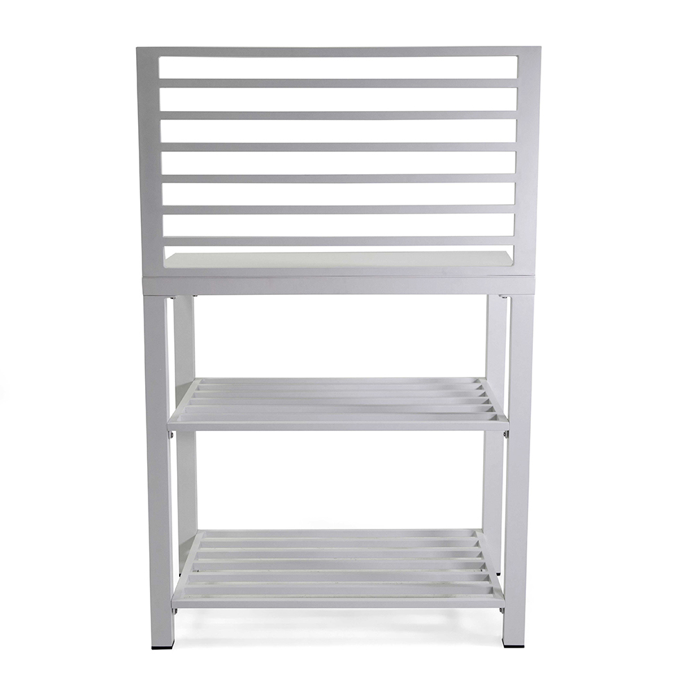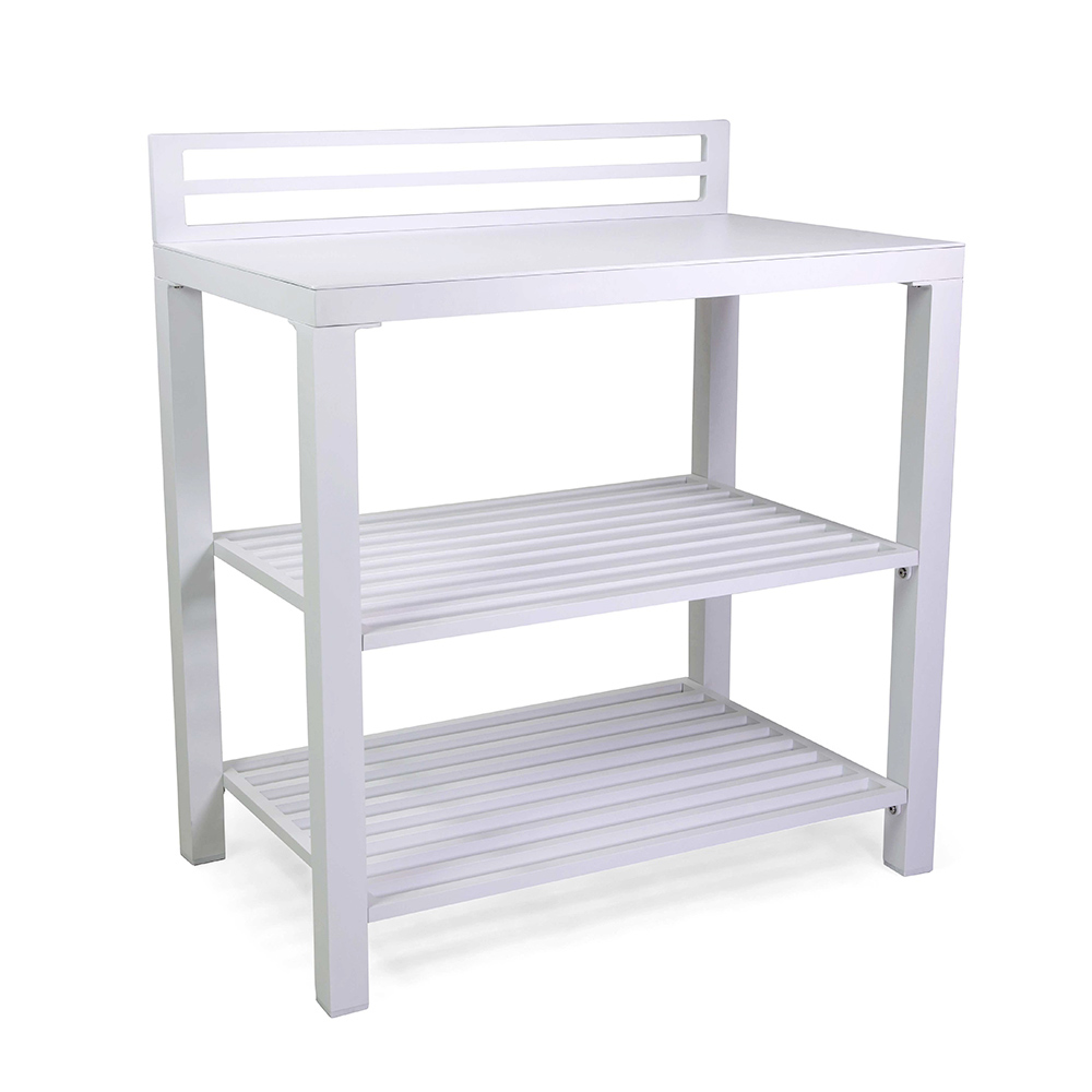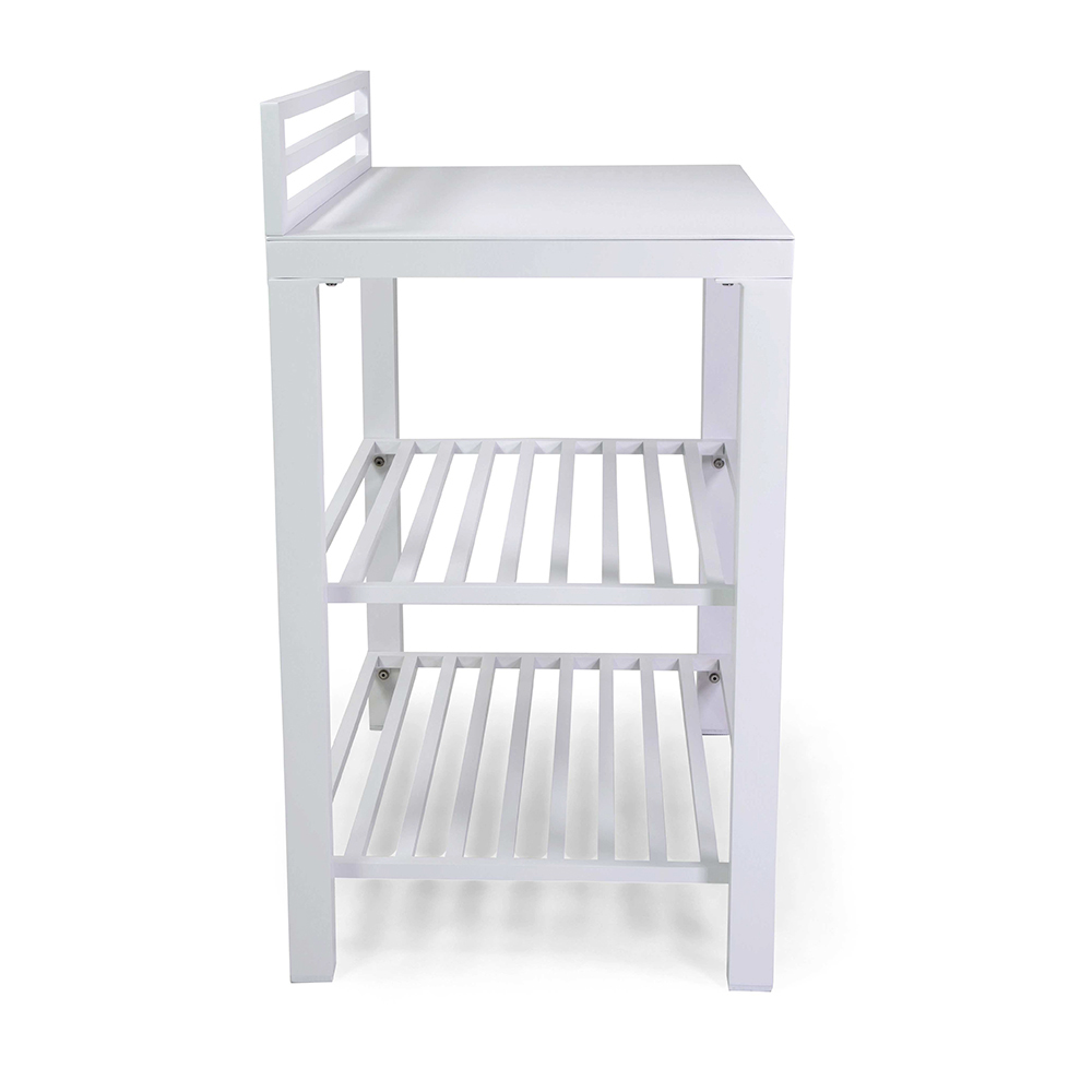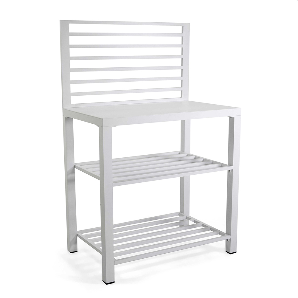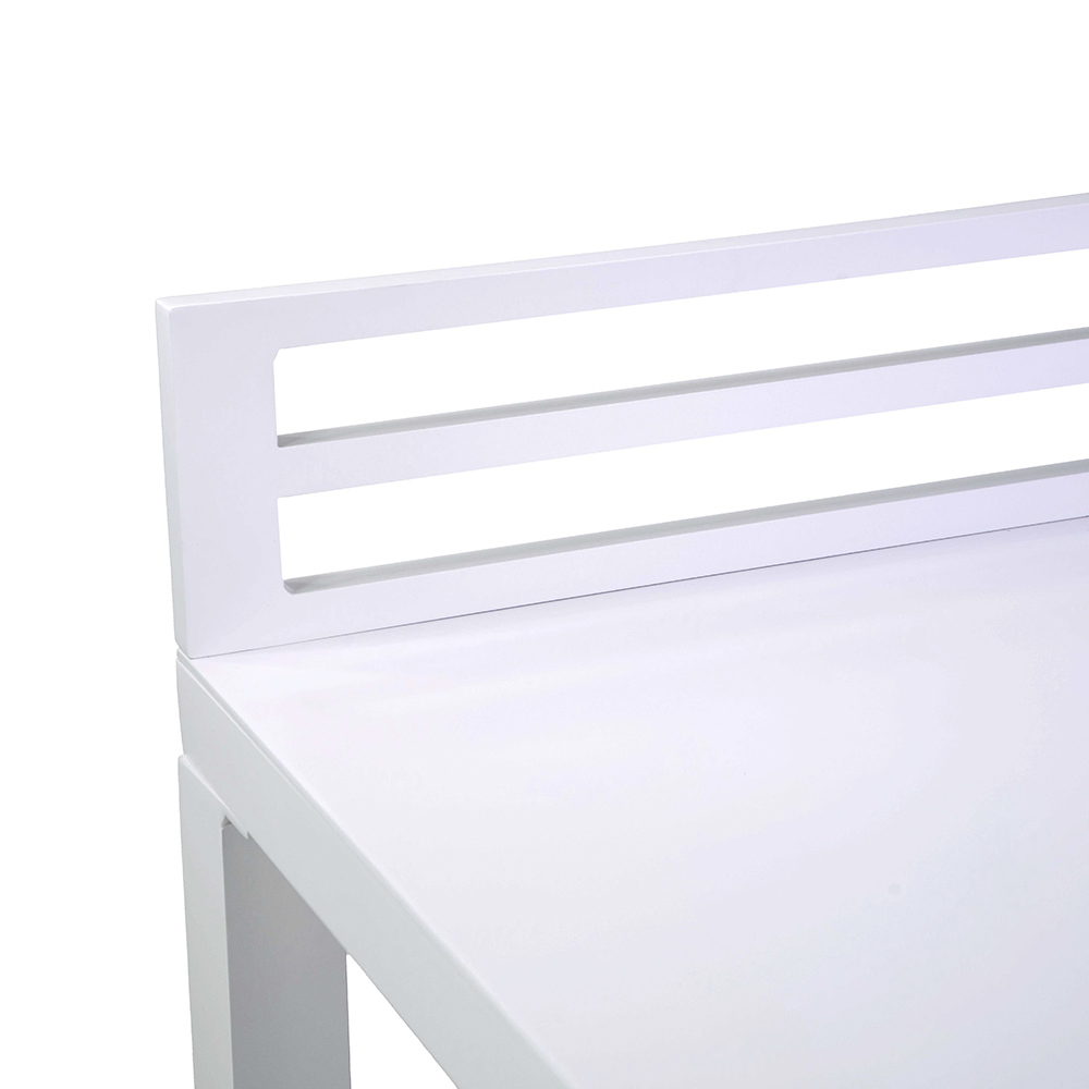 Detta multifunktionella aluminiumskåp, med en ren och modern design, är den perfekta lösningen för att organisera och berika alla utomhusutrymmen. Med sin vita finish passar det perfekt med olika inredningsstilar, från ultramoderna till klassiska. Den robusta aluminium-strukturen garanterar hållbarhet och stabilitet, vilket effektivt motstår utomhuselement. Utrustad med stora hyllor erbjuder den generöst med utrymme för växter, dekorationer eller som en servicestation under dina kvällar utomhus. De minimalistiska linjerna och det aerodynamiska utseendet gör detta skåp till ett elegant och funktionellt tillskott till terrasser, trädgårdar eller balkonger.