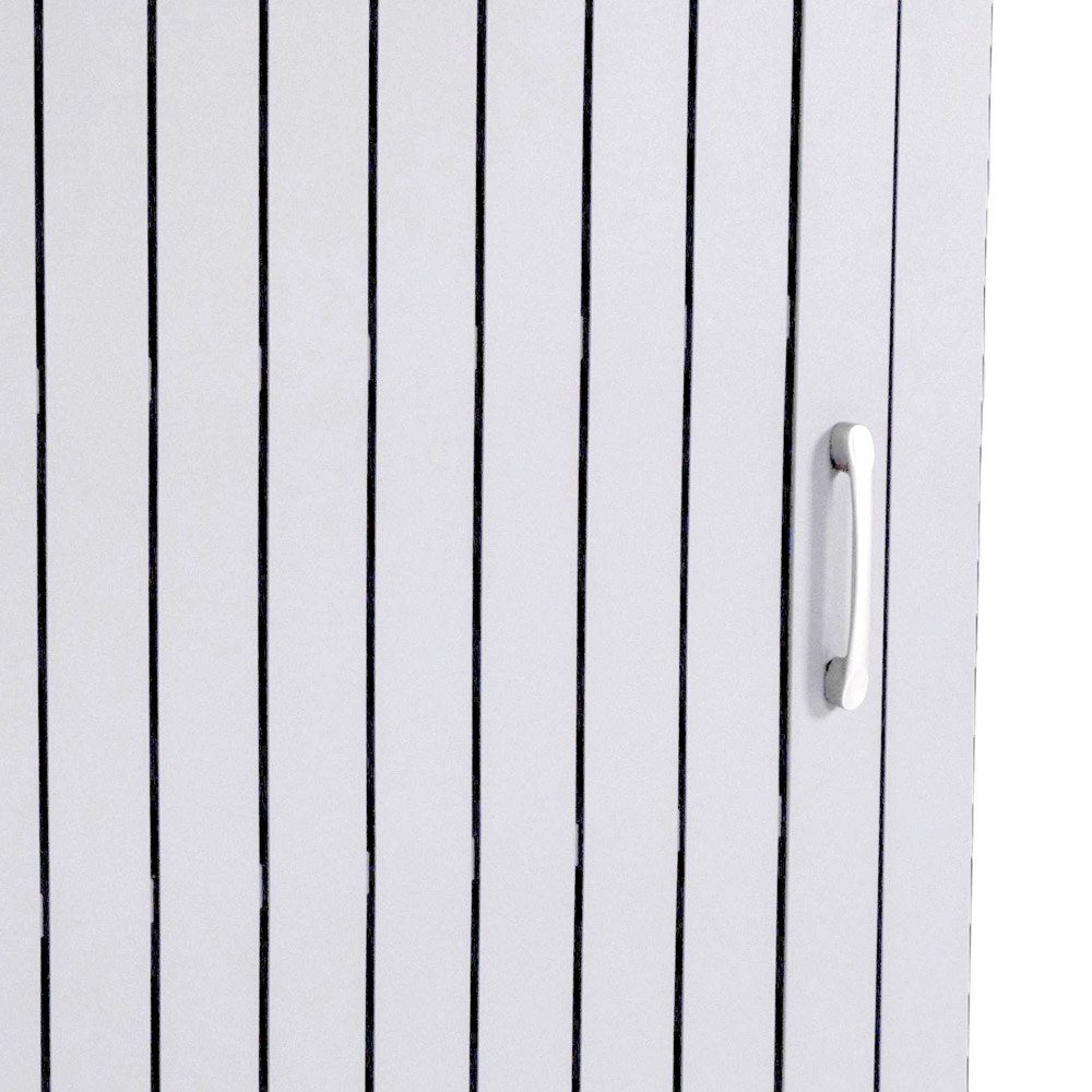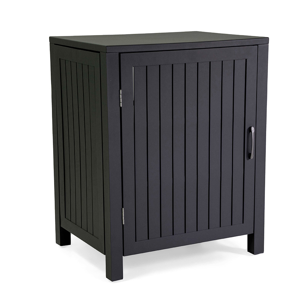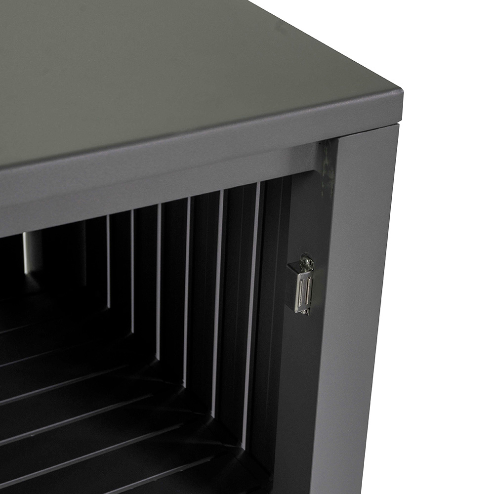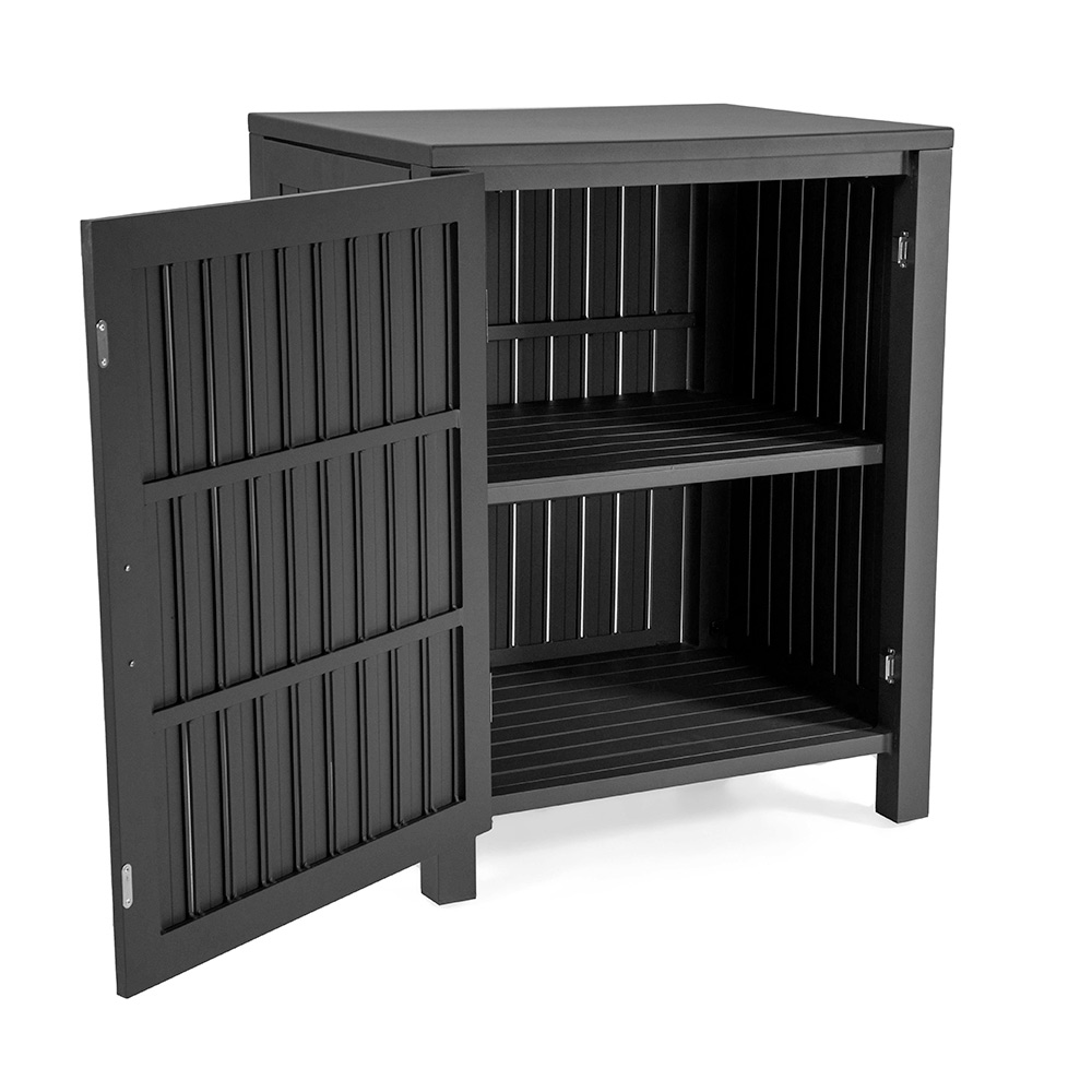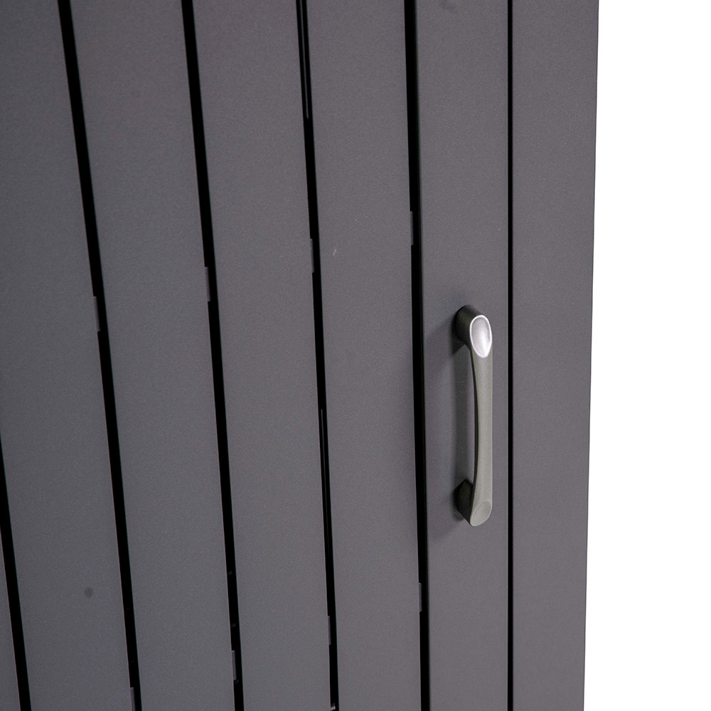 Designen med spaltdörr är inte bara estetiskt tilltalande utan ger också tillräcklig ventilation, vilket gör den idealisk för förvaring av utomhuskuddar, trädgårdsredskap eller pooltillbehör.