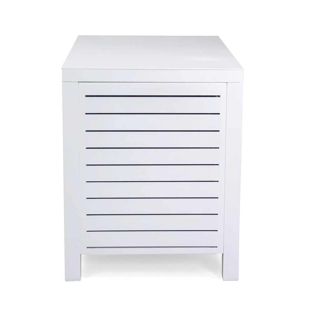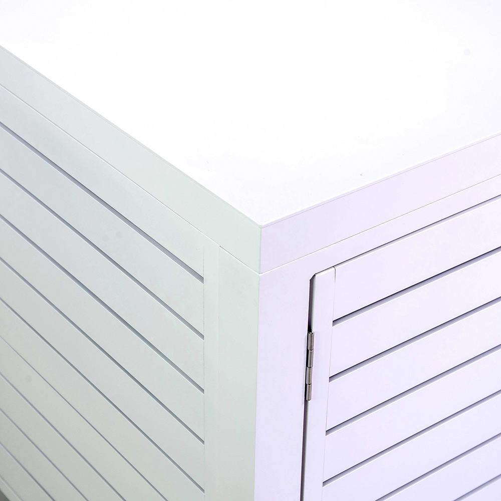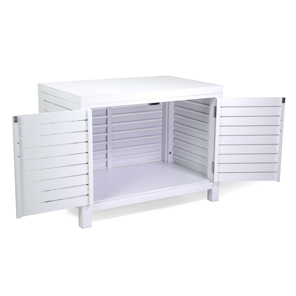 Lägg till en touch av modern elegans till ditt utomhusutrymme med detta sofistikerade aluminiumskåp, som passar perfekt in i alla utomhusmiljöer. Den rena lamelldesignen skapar en visuellt tilltalande effekt, vilket gör det till ett funktionellt och dekorativt mittpunkt.