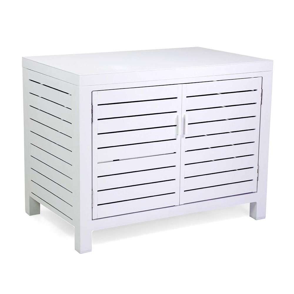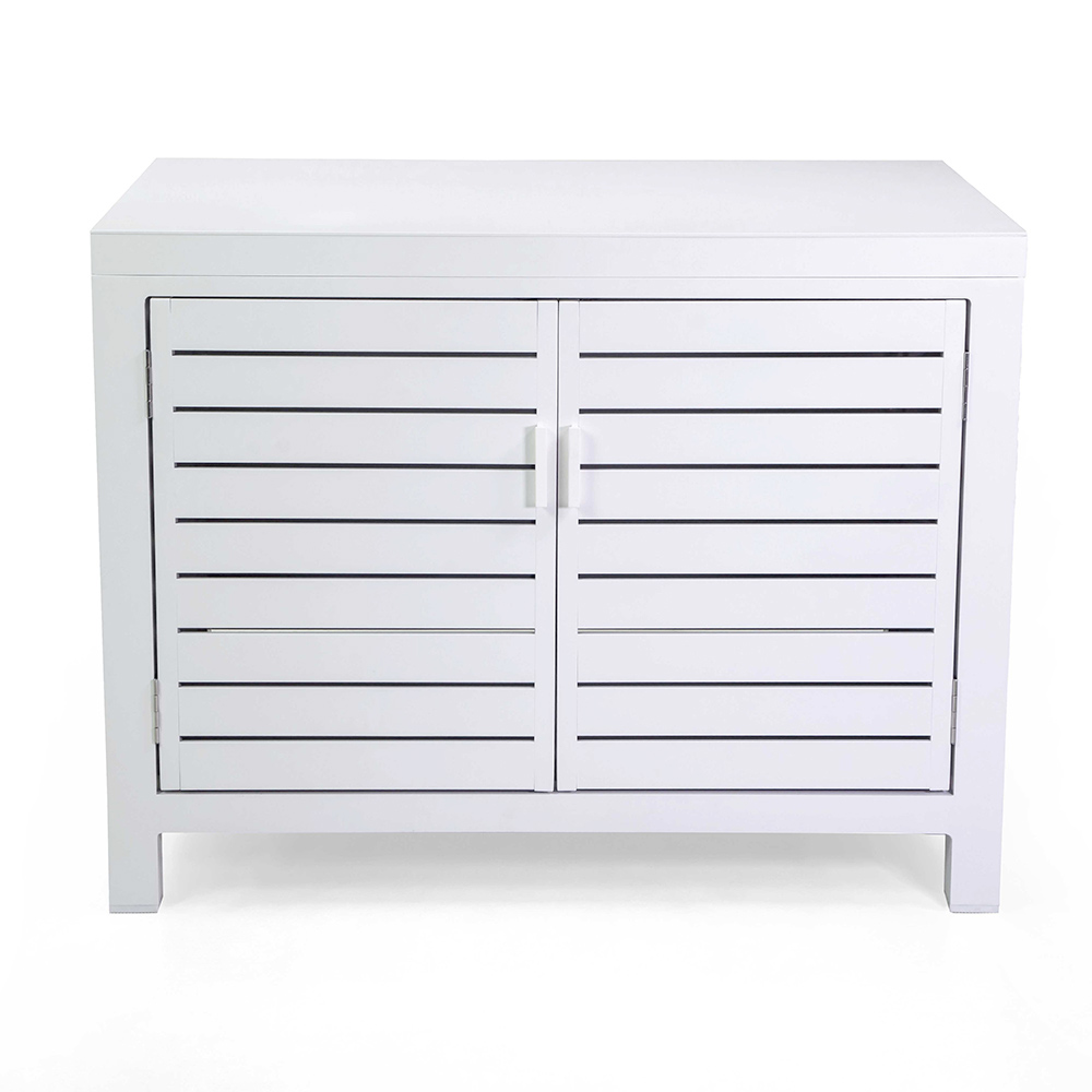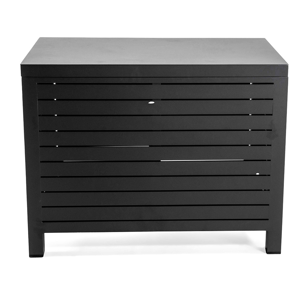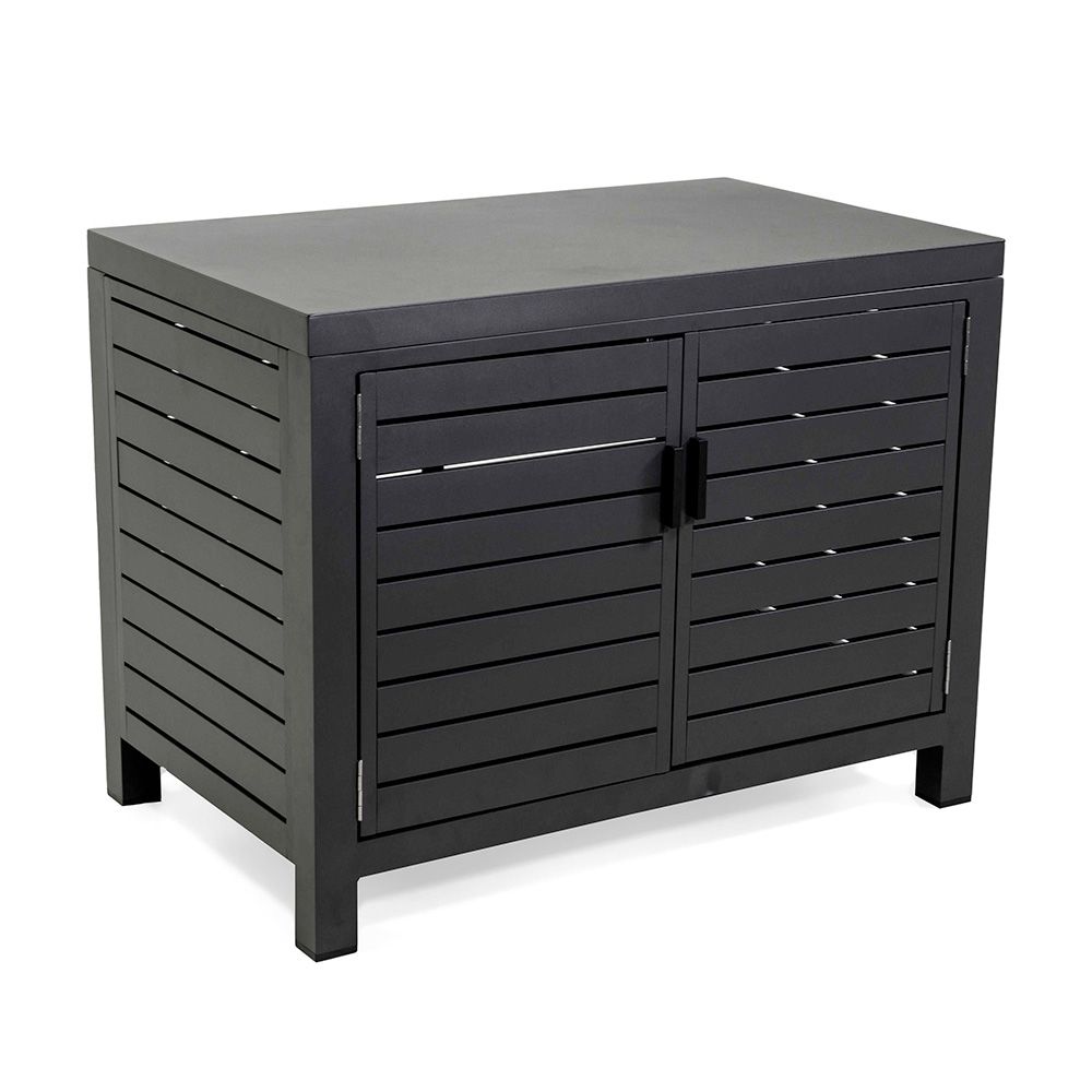 Lägg till en touch av modern elegans till ditt utomhusutrymme med detta sofistikerade aluminiumskåp, som passar perfekt in i alla utomhusmiljöer. Den rena lamelldesignen skapar en visuellt tilltalande effekt, vilket gör det till ett funktionellt och dekorativt mittpunkt.