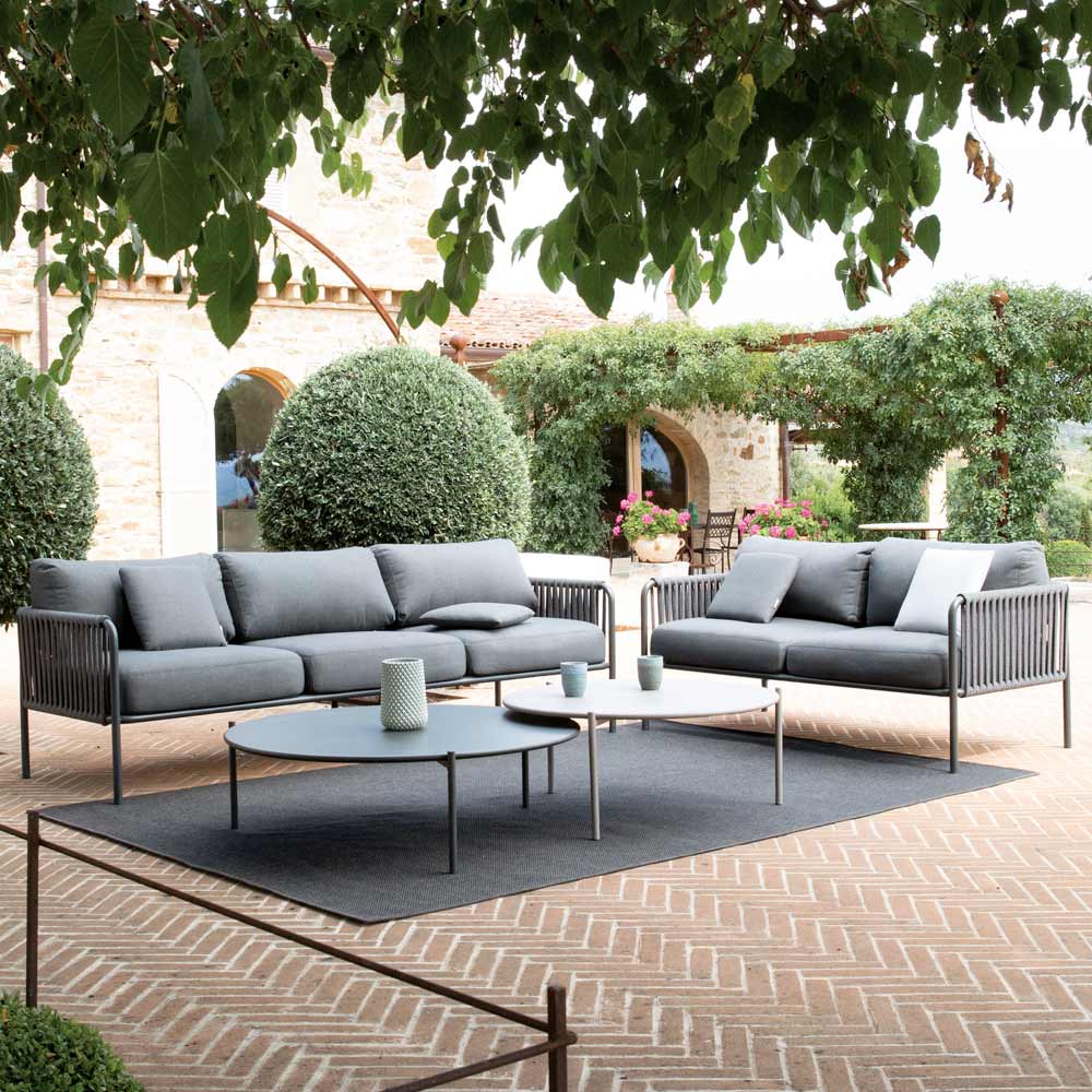 Trädgårdssoffa i stål och rep i olika storlekar med kuddar Tillverkad i Italien.