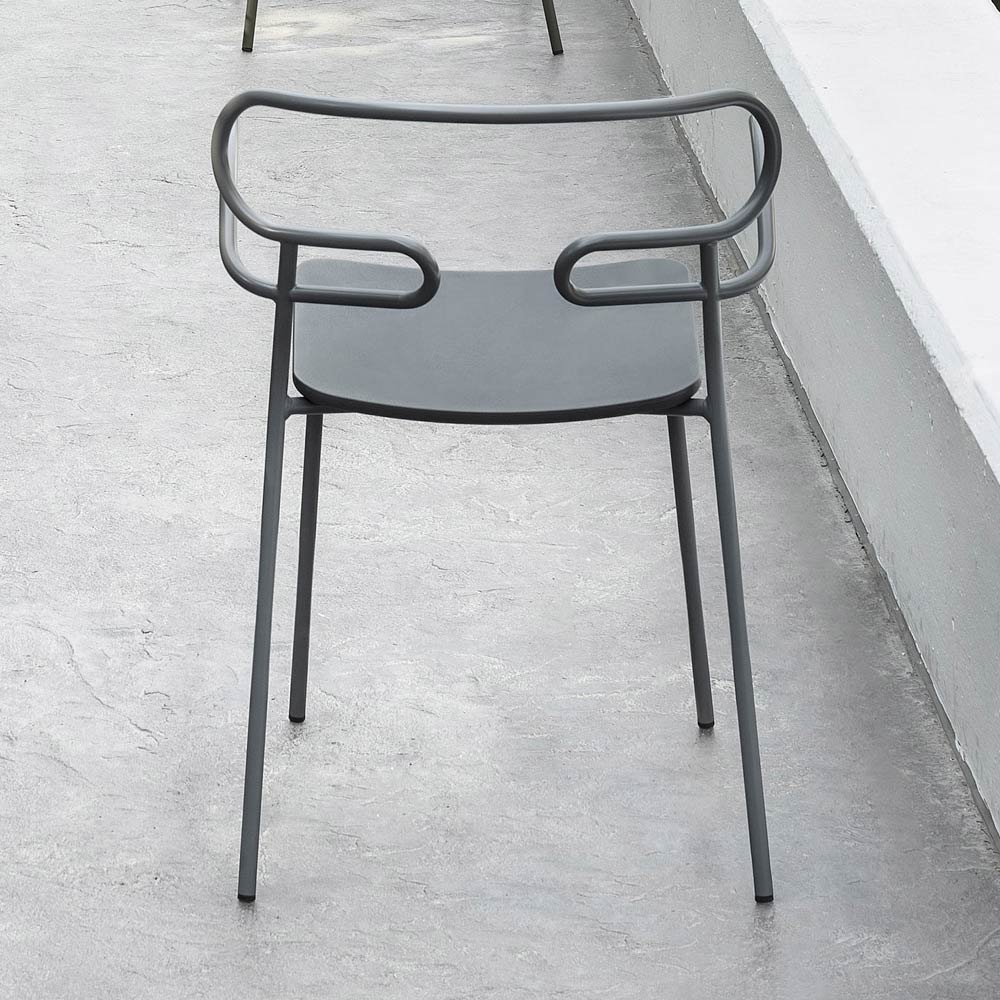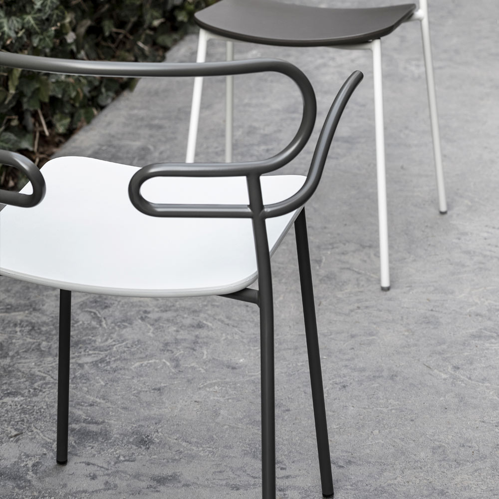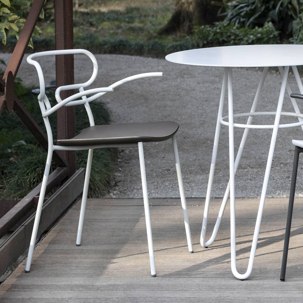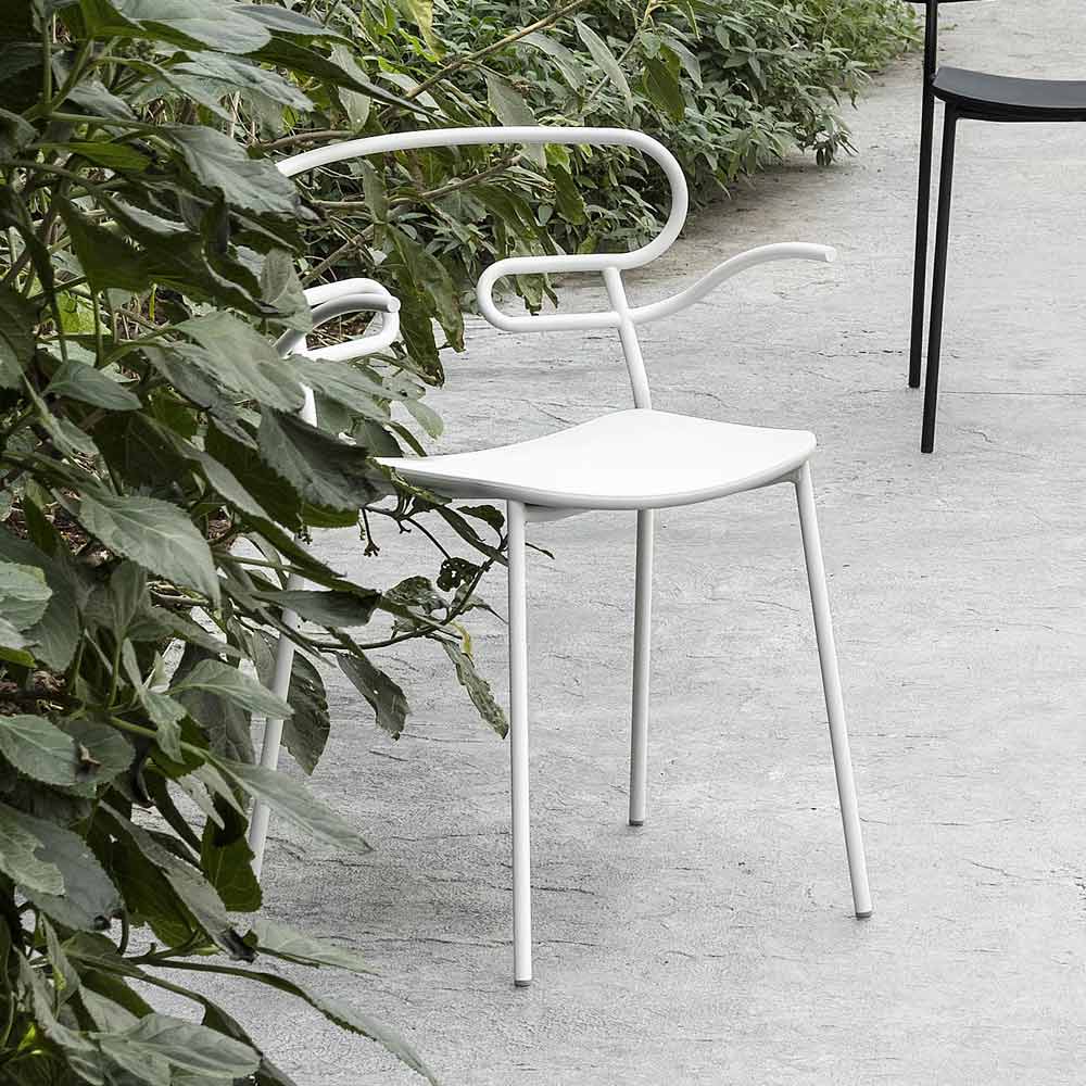 Utomhusstol tillverkad i Italien med målad metallkonstruktion och säte i polyuretan. Enkelt och väsentligt, detta komplement sticker ut tack vare dess ljusa linjer och den speciella formen på ryggstödet som uppnås genom krökningen av ett enda metallrör, vilket skapar en ovanlig och avantgardistisk design. Perfekt för att dekorera dina utomhusområden med personlighet som trädgårdar, verandor och terrasser, den har en särskilt funktionell funktion som är möjligheten att stapla för att få en praktisk och lättanordnad lösning genom att optimera dina utrymmen när stolarna inte används.