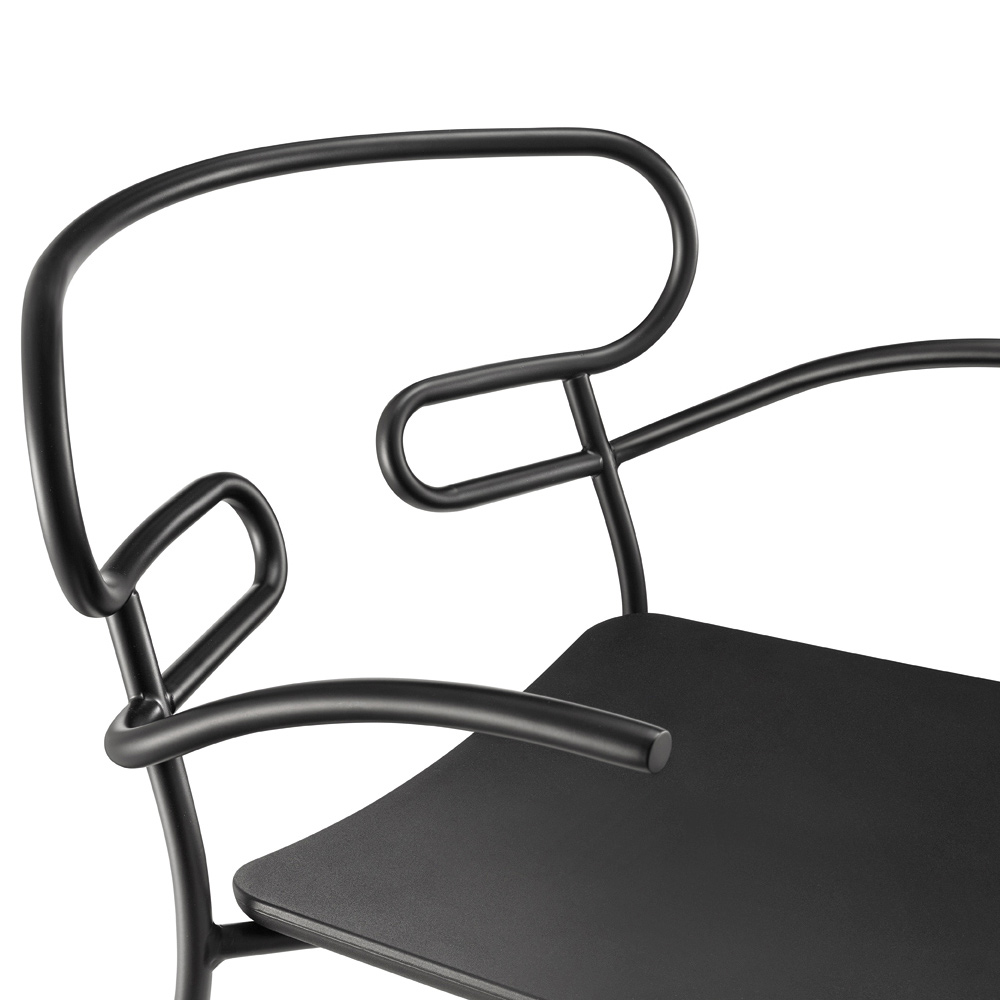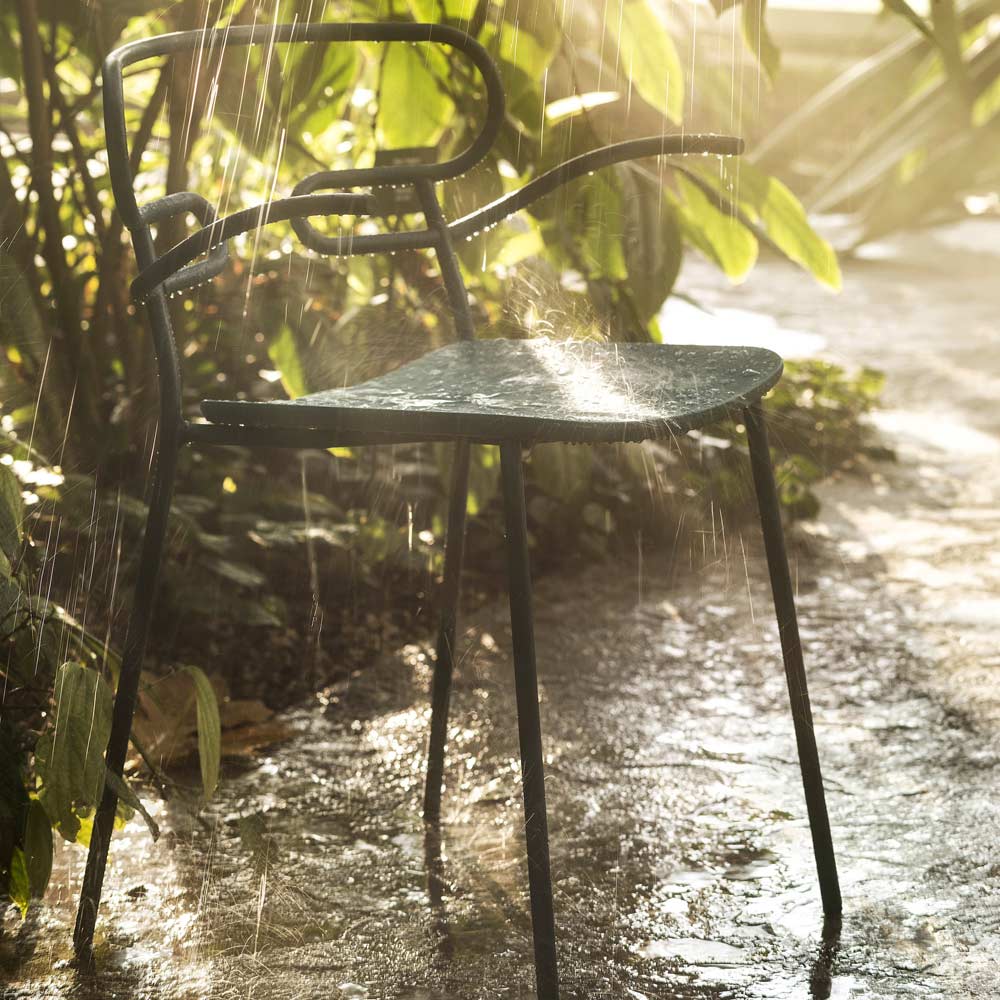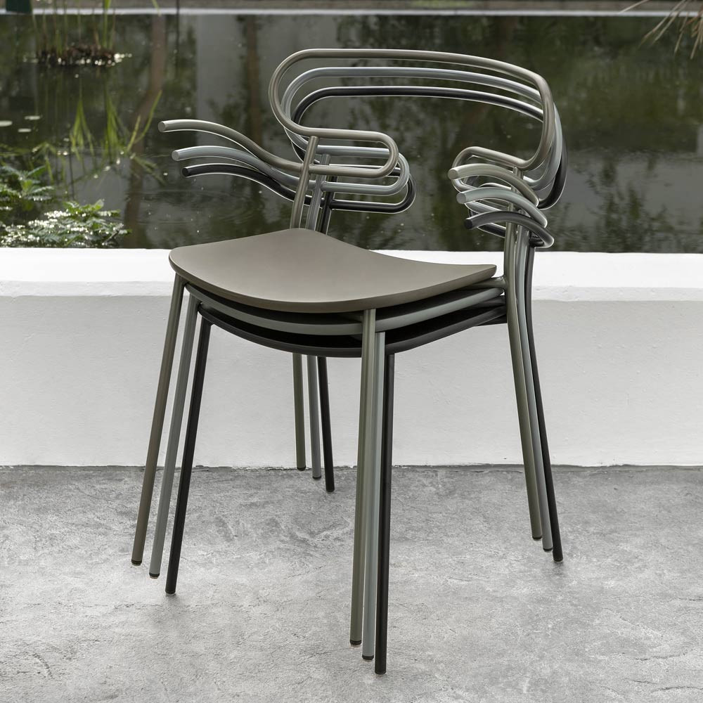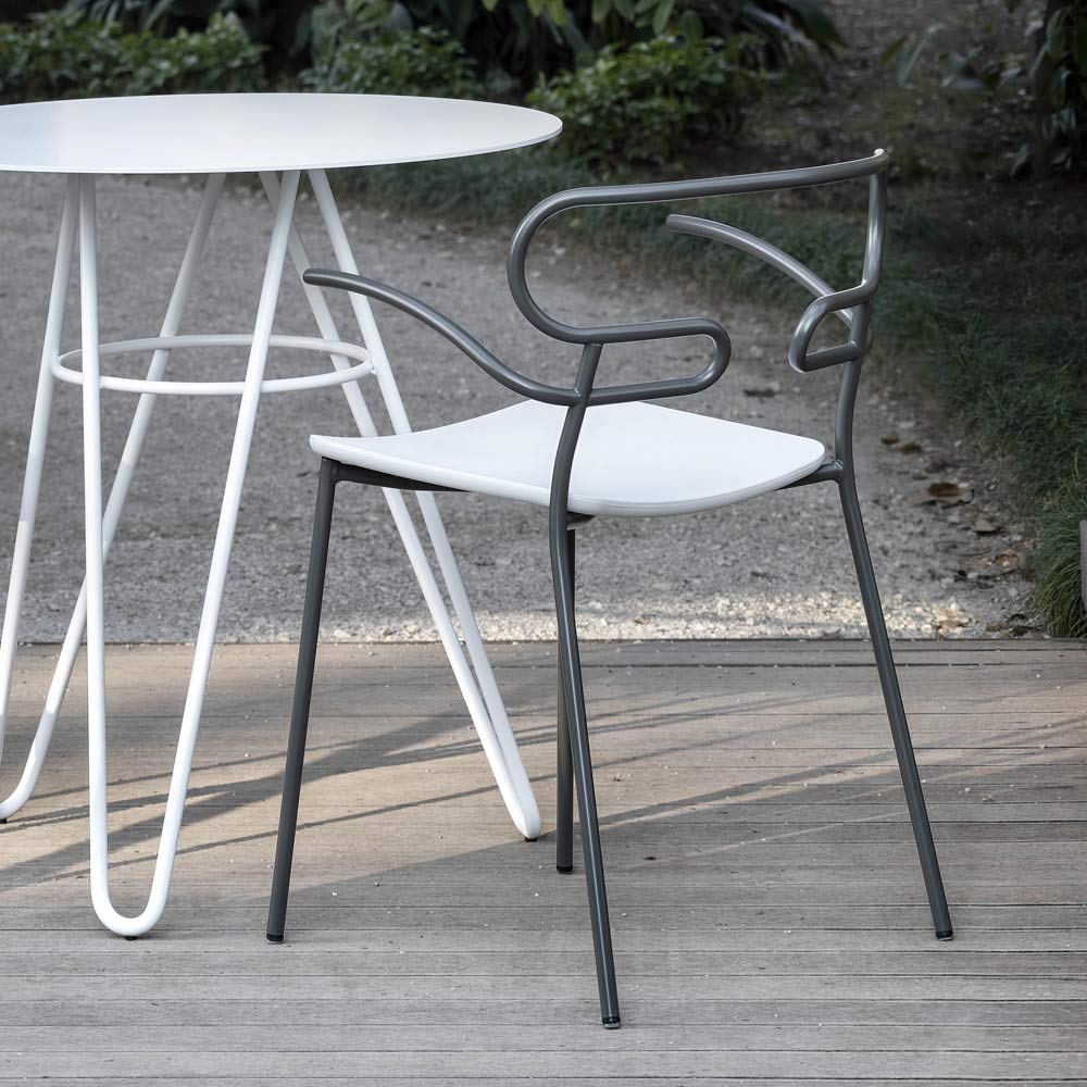 Utomhusstol tillverkad i Italien med målad metallkonstruktion och säte i polyuretan. Enkelt och väsentligt, detta komplement sticker ut tack vare dess ljusa linjer och den speciella formen på ryggstödet som uppnås genom krökningen av ett enda metallrör, vilket skapar en ovanlig och avantgardistisk design. Perfekt för att dekorera dina utomhusområden med personlighet som trädgårdar, verandor och terrasser, den har en särskilt funktionell funktion som är möjligheten att stapla för att få en praktisk och lättanordnad lösning genom att optimera dina utrymmen när stolarna inte används.