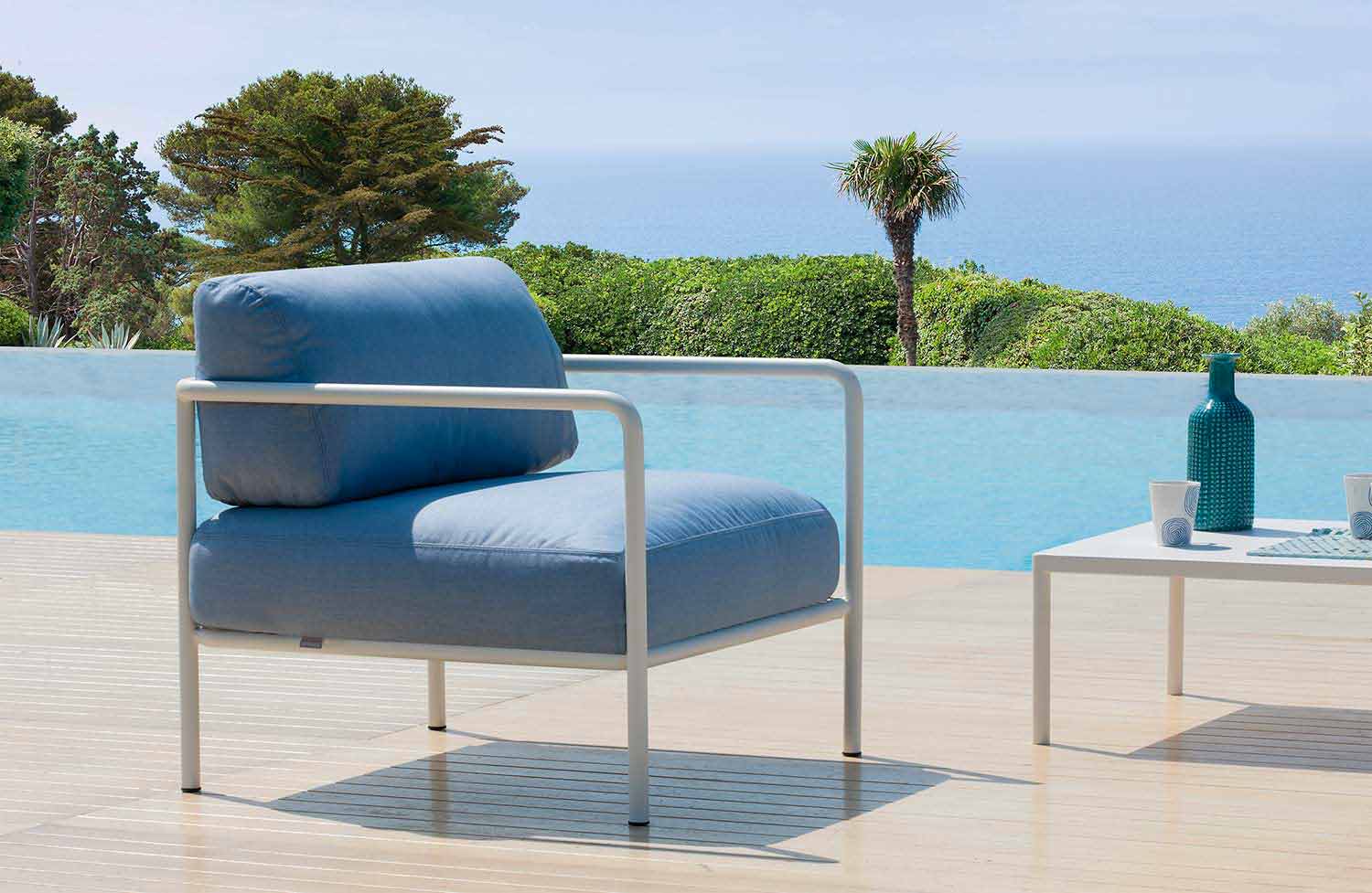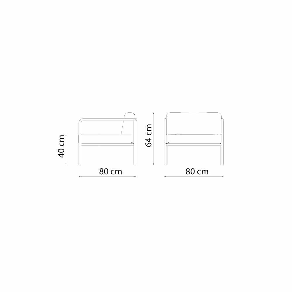pulverlackerat galvaniserat järn, målat med värmehärdande pulver, medan sits- och ryggdynan är tillverkade av 100 % färgat akryltyg. Dessa två material ger produkten en soliditet utan att försumma den visuella och dekorativa aspekten. Perfekt för att komplettera möbler i utomhusmiljöer som kräver elegans och personlighet tack vare de minimalistiska linjerna som gör den till ett objekt med en unik design.
