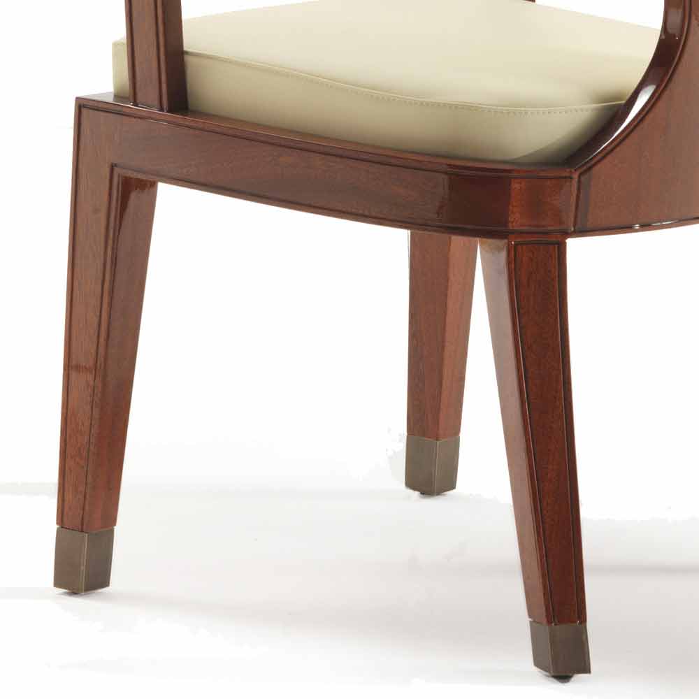 Framsidan av ryggstödet är i mjuk trä, medan den bakre delen av ryggstödet är av trä fungerade. Sitsen är klädd i läder, sonderna är bronserad mässing. Kom i polerad mahogny.