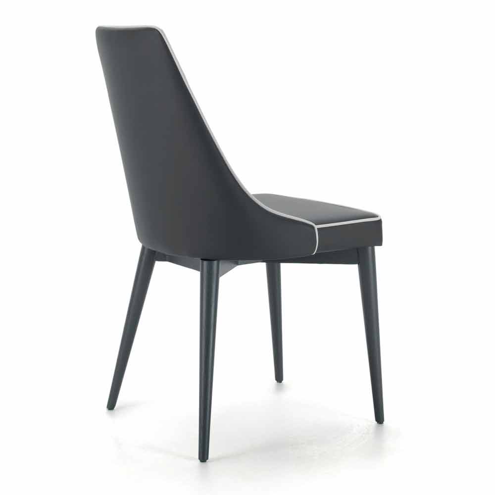 Lyxig vadderad stol med fot i grafitstål och sits i ekoläder med vita kanter; handgjorda i Italien.