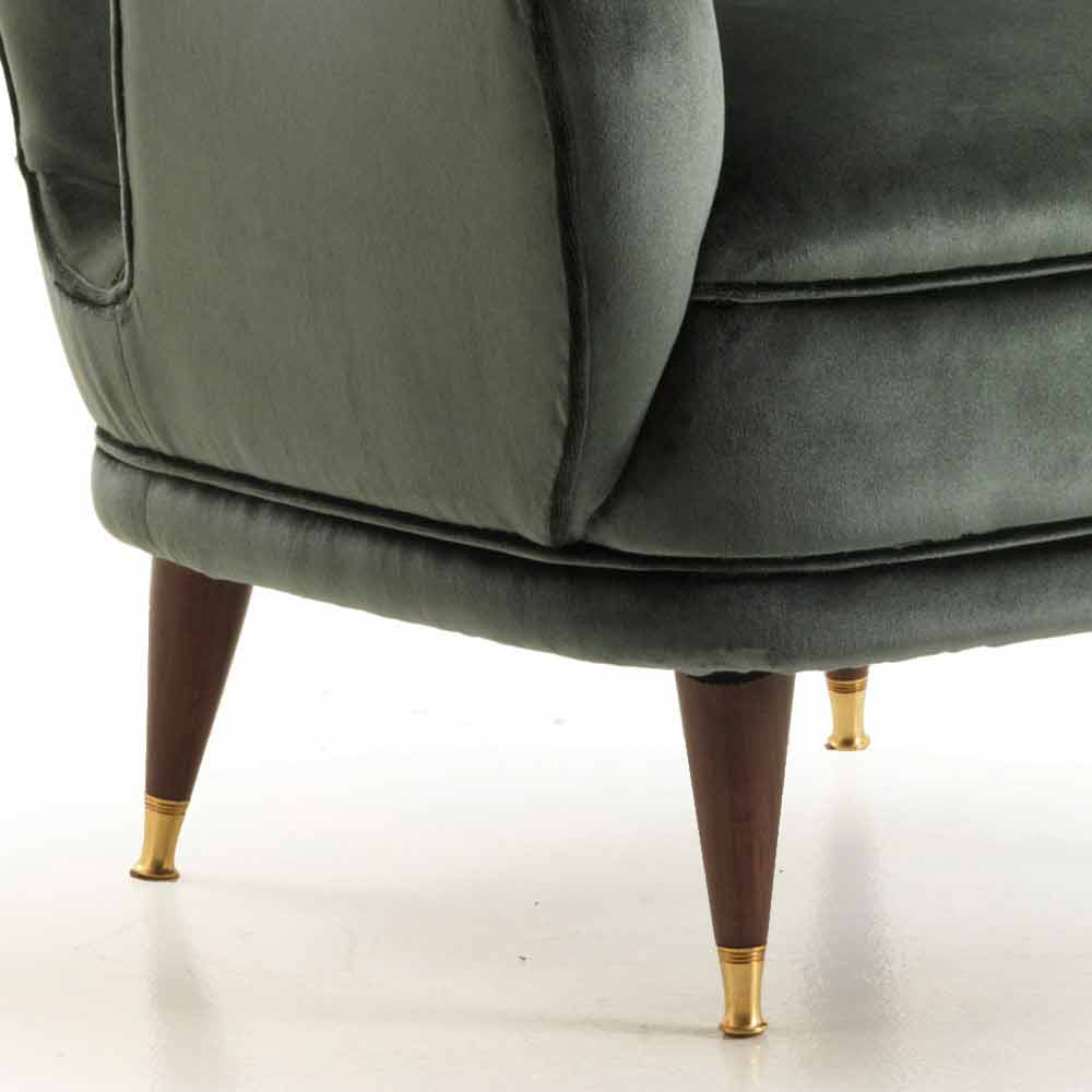 Klädd med patinerad klämmor mässing. Benny är inspirerad av kammar fåtöljer av en tid som har lånat från de slingrande och sensuella former och i tunna träben och avsmalnande. sittdynan, placerad vid en reducerad höjd, är sammansatt av en tjock stoppning samt den höga och breda ryggstödet och de två armstöd, vilket ger en extra upplevelse av komfort. Formen på ryggstödet påminner i mycket feminin kurvor proportioner, avgränsar en smal midja som vidgar klättrar uppåt. Kom i mörk amerikansk valnöt.