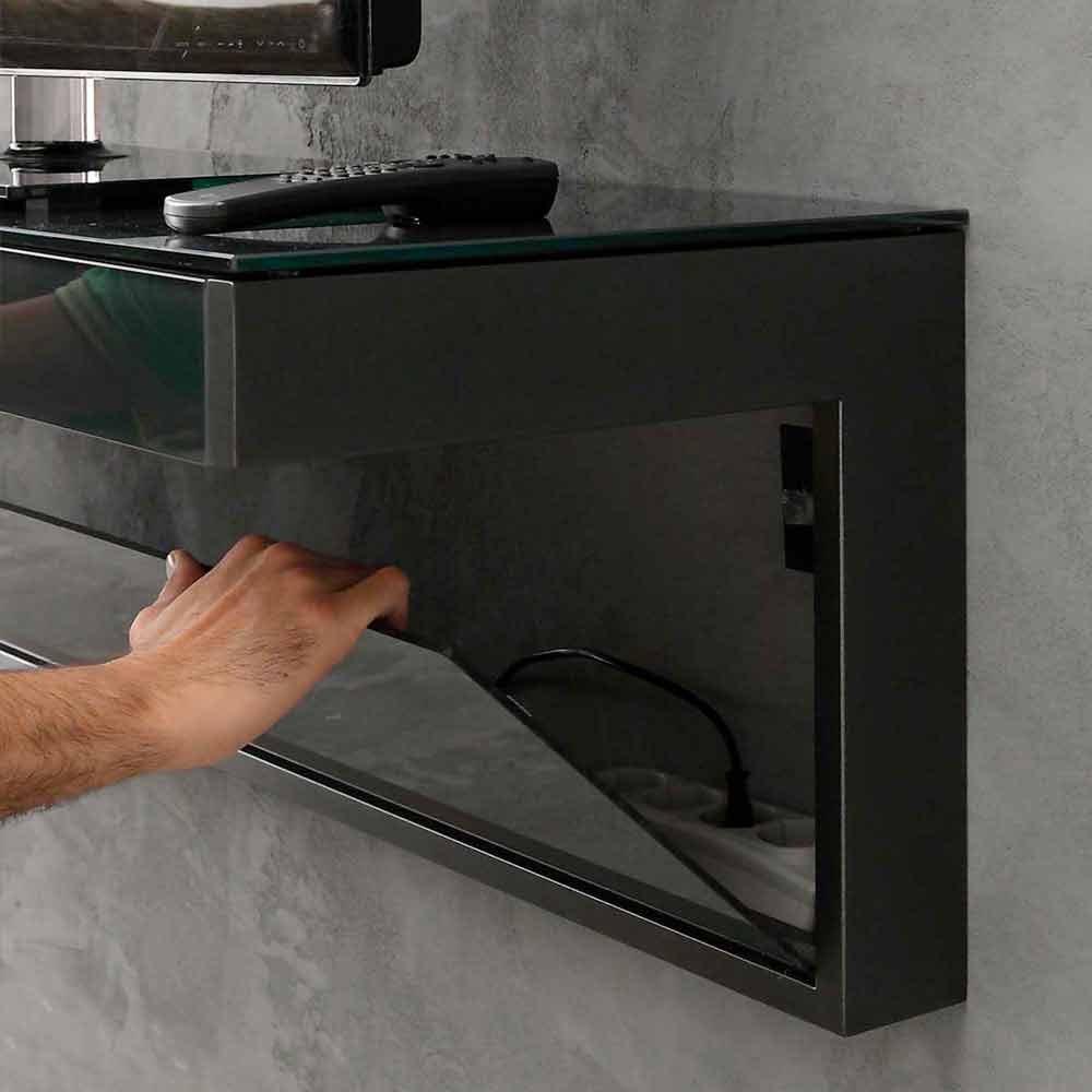 Exklusivt hängande TV-skåp (väggmontering) tillverkat i Italien med blank svart glastopp med kabelhål, matt svartmålad metallstruktur och avtagbar vertikal plexiglaspanel . Den är också komplett med en avtagbar frontlåda placerad under toppen.