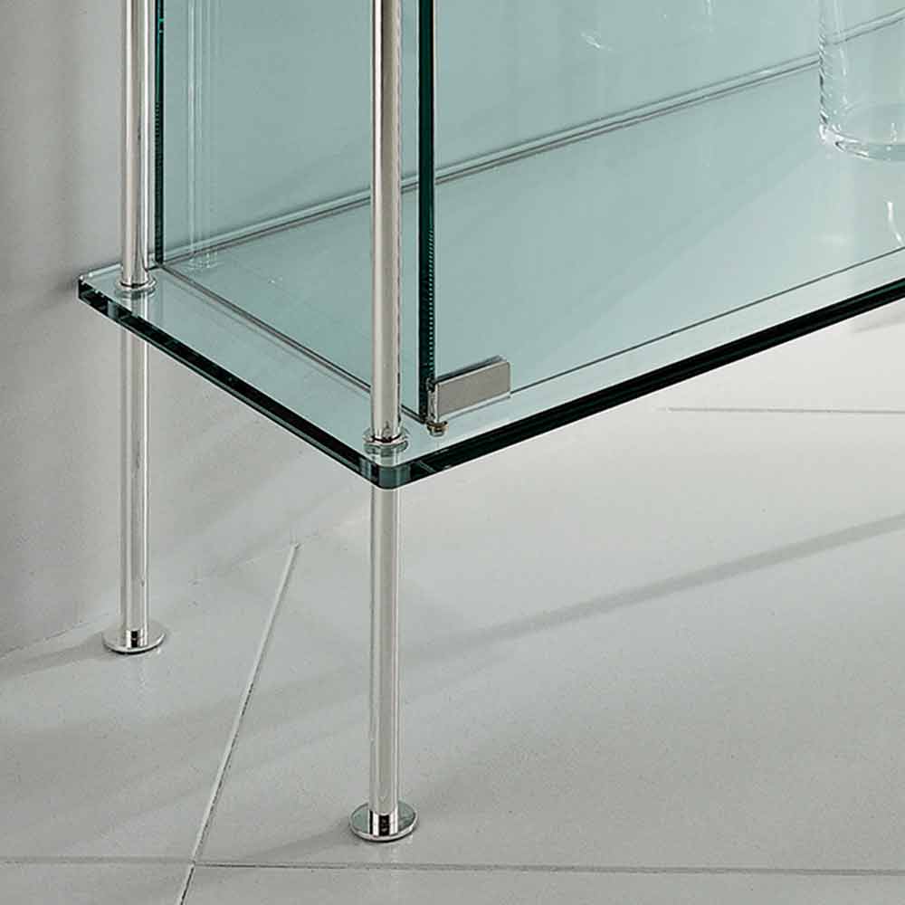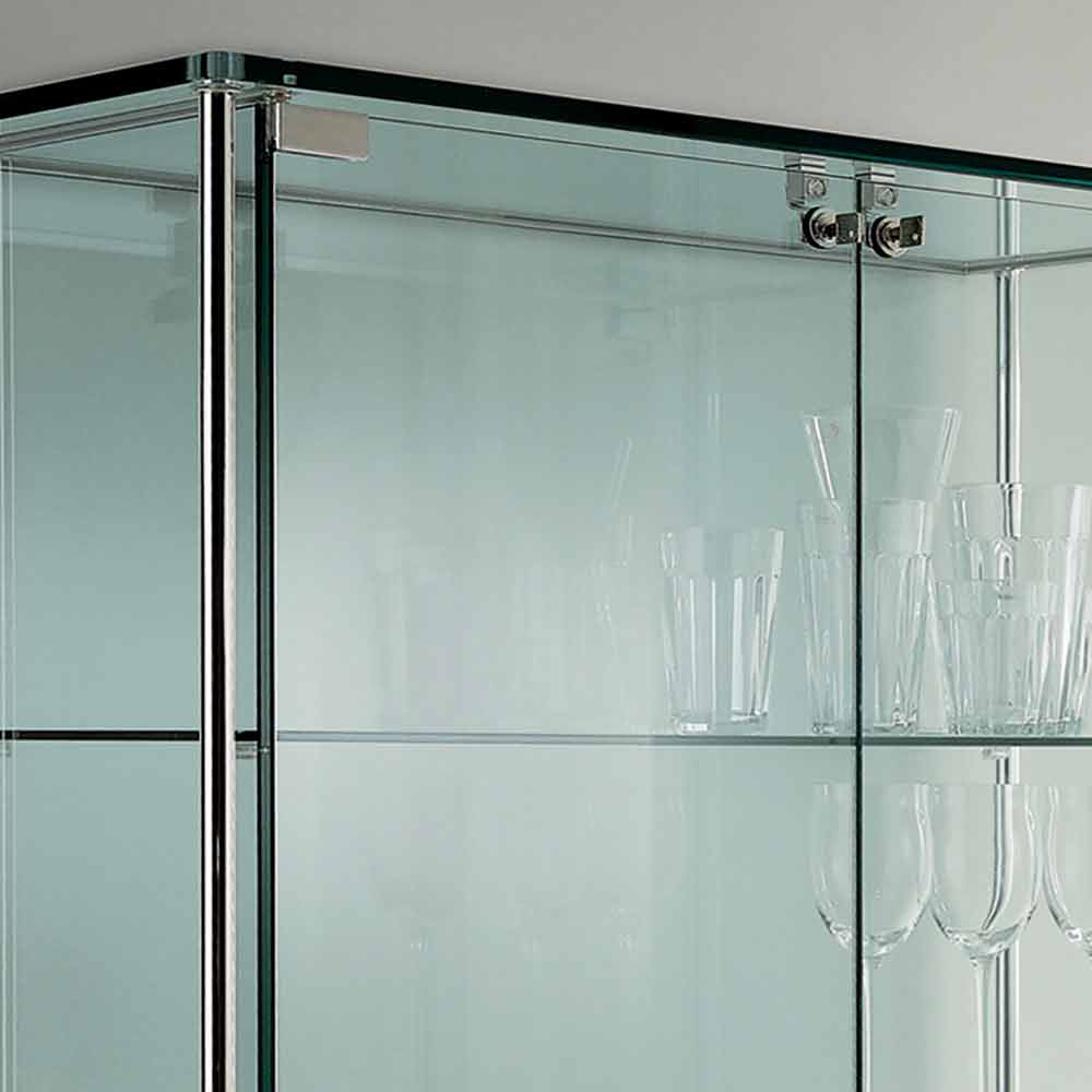 Två-dörrars skåp är helt och hållet tillverkat av genomskinligt härdat glas med rostfritt stål metallstängning och stöd.