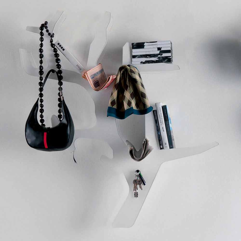 Idealisk för att organisera böcker, tidskrifter, CD-skivor men också som en praktisk klädhängare. Den här hyllan kan representera både ett funktionellt möbel och ett originellt dekorativt komplement. En innovativ idé som gör inredningen av dina utrymmen till en riktigt rolig som gör att du kan berika miljön med personlighet tack vare en touch av färg. De tillgängliga färgerna erbjuder möjligheten att infoga den i alla delar av huset och lyckas kombinera den med de mest varierade möbler, från de mest kreativa och färgglada till de mest nykter och diskreta. Dess estetiska omfattar funktionalitet och design och erbjuder en extremt kreativ inredningslösning som kan förnya alla utrymmen med sin livliga själ.