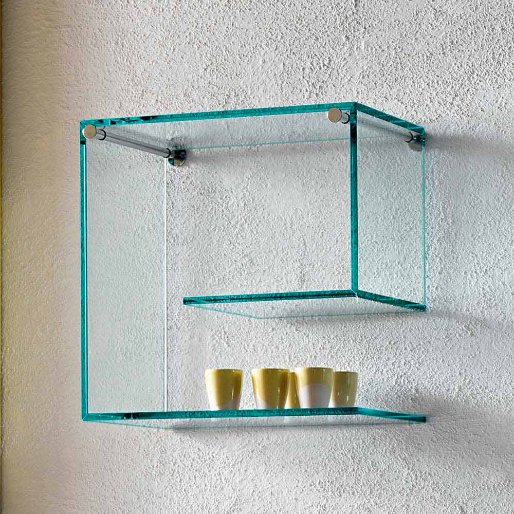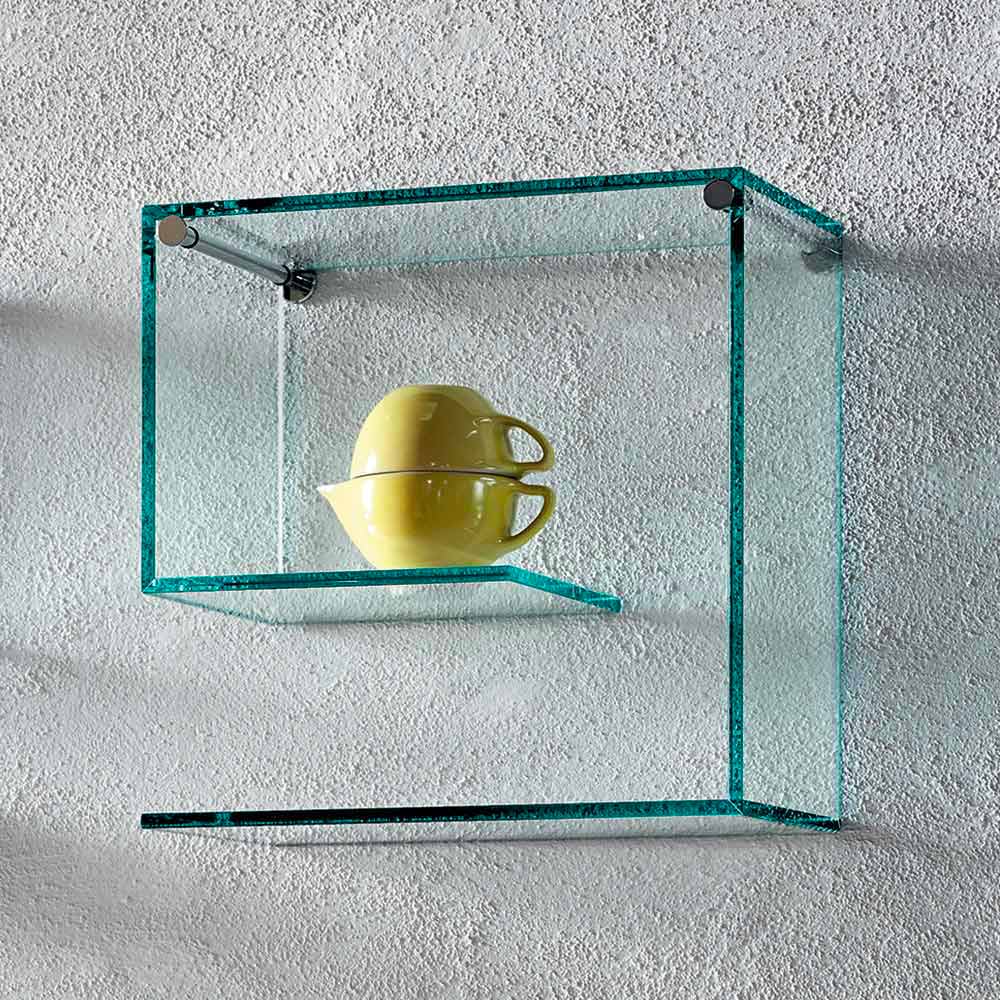 Detta par vägghyllor kännetecknas av sin mångsidiga och geometriska design helt gjord av 10 mm tjockt flottörglas i den transparenta ytan.