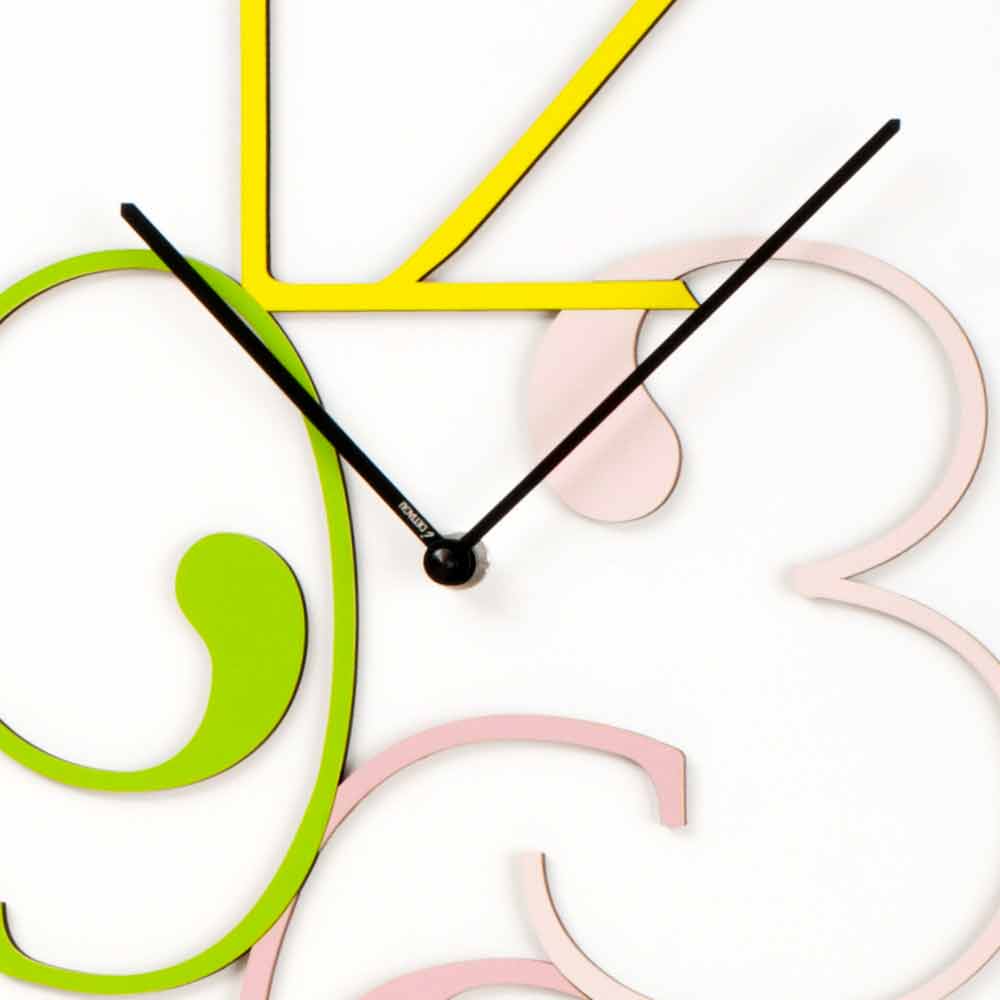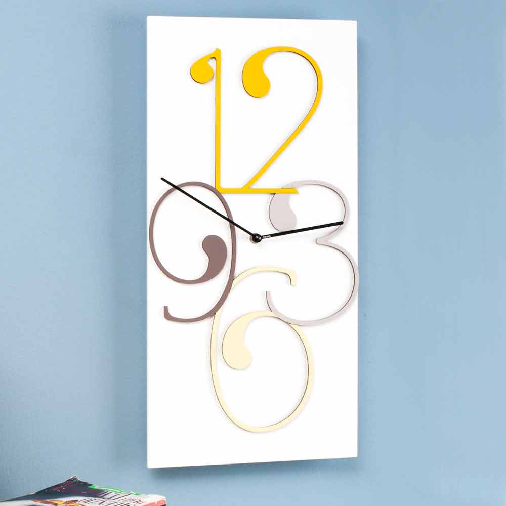 Väggklocka i ogenomskinligt vitt trä med färgade nummer, två versioner av rektangulär och modern design tillverkad i Italien.