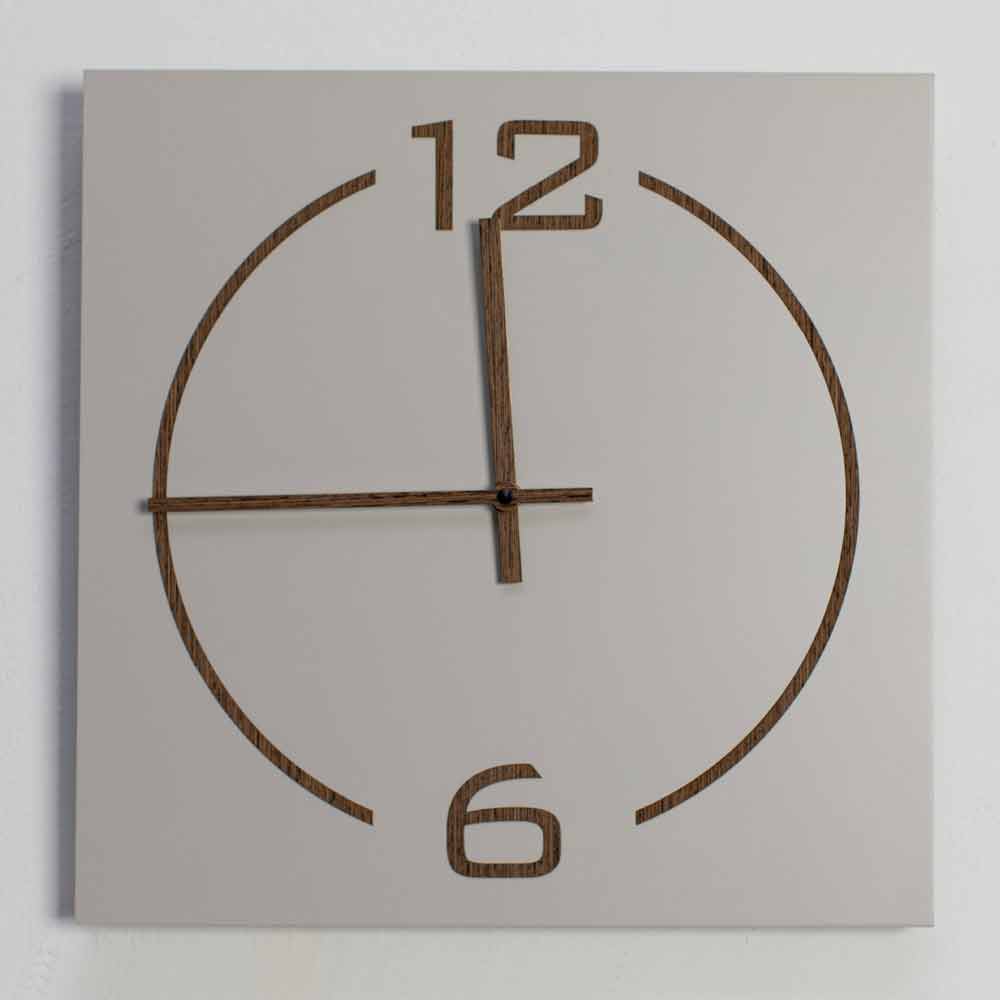 Modern och rund designväggklocka i beige lackerat trä och valnötdekorationer och händer, tillverkade i Italien.