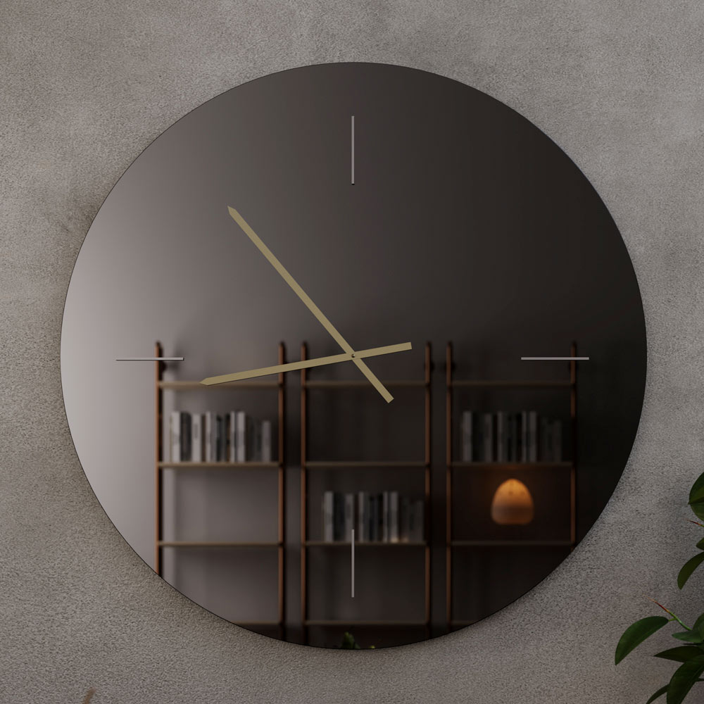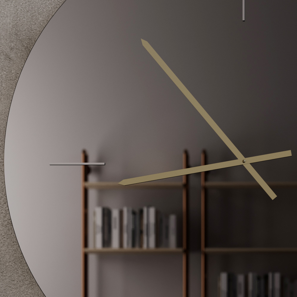 De tunna, eleganta mässingsvisarna i satinfinish framträder elegant mot den rökfärgade bakgrunden och skapar en raffinerad och harmonisk kontrast. Den minimalistiska designen, fri från överflödiga element, gör denna klocka till ett verkligt dekorativt föremål som kan förhöja moderna vardagsrum, matsalar, chefskontor och kontorsutrymmen.