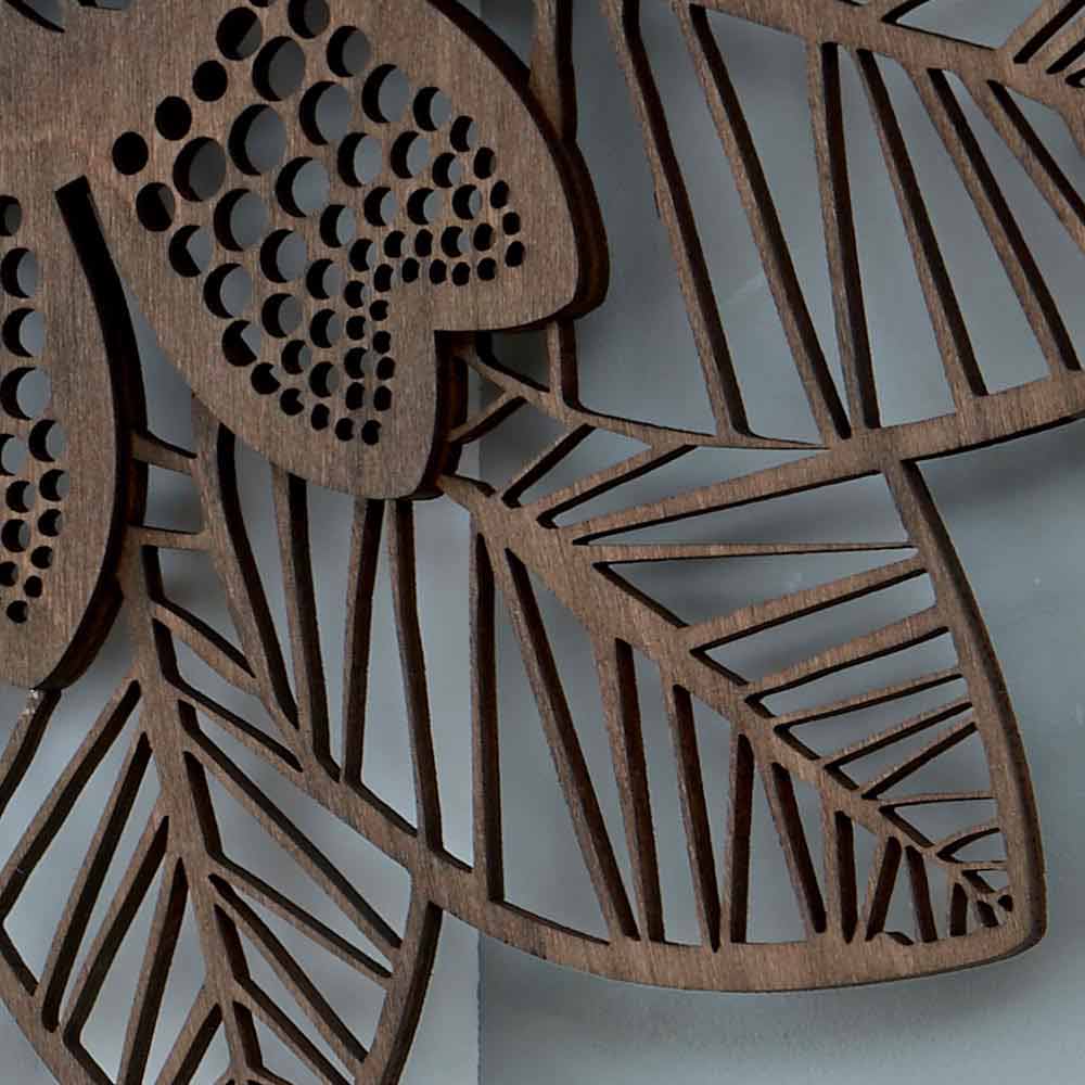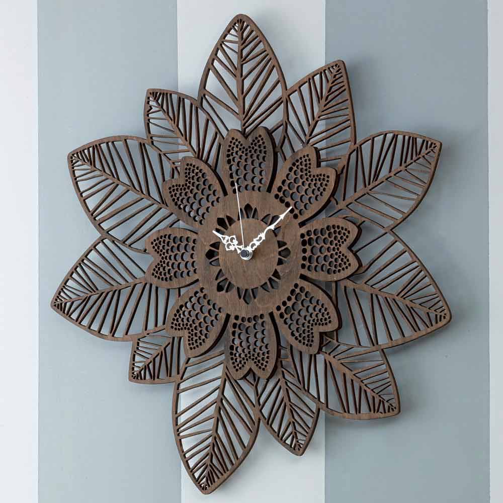 Modern väggklocka, design i lätt trä eller wengè, blommig form tillverkad i Italien.
