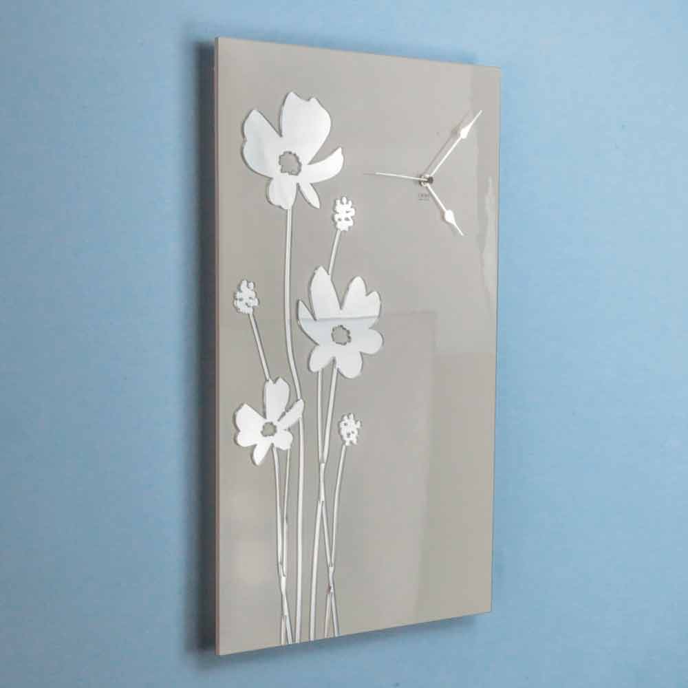 Rektangulär väggklocka av modern design i vitt trä med inlagda plexiglasspeglar, tillverkade i Italien.
