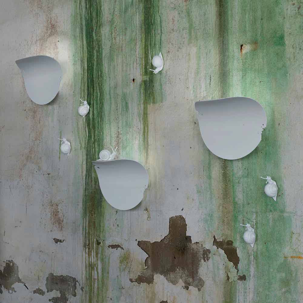 Lampan är gjord av vit aluminium medan det snigelformade tillbehöret i ogenomskinlig vit keramik, för en helt italiensk design som genom okonventionellt experiment och kontinuerlig forskning mellan tradition och modernitet kan förvåna, våga och upphetsa. så att du kan uttrycka dina känslor genom en original och personlig dekorativ användning av ljus.