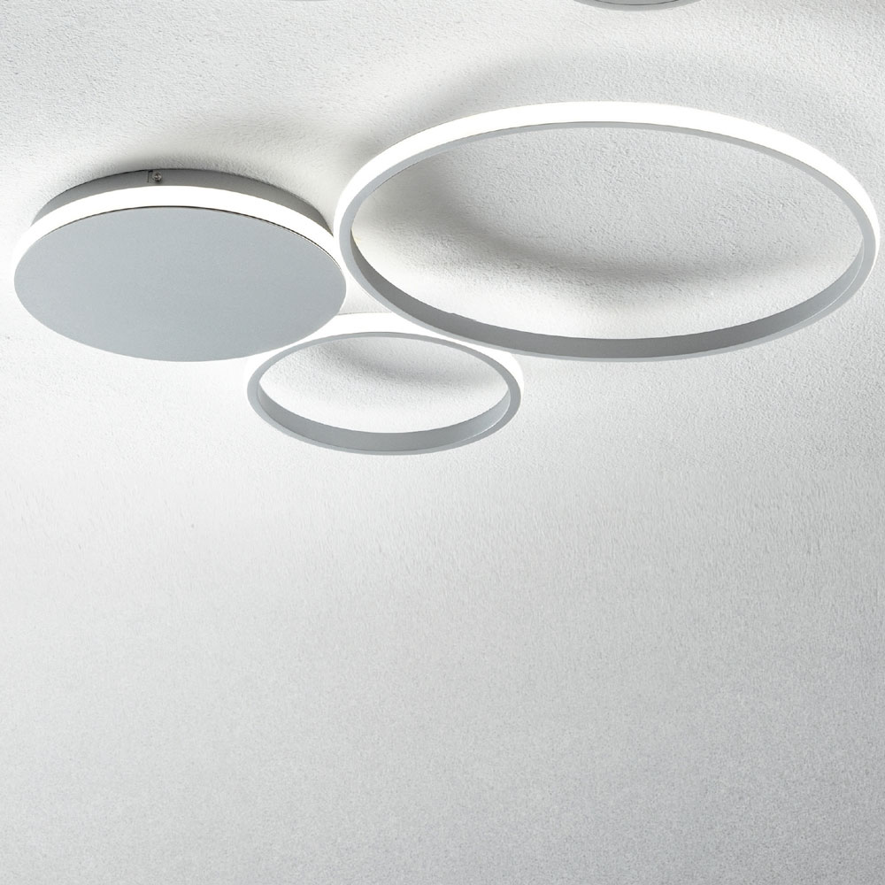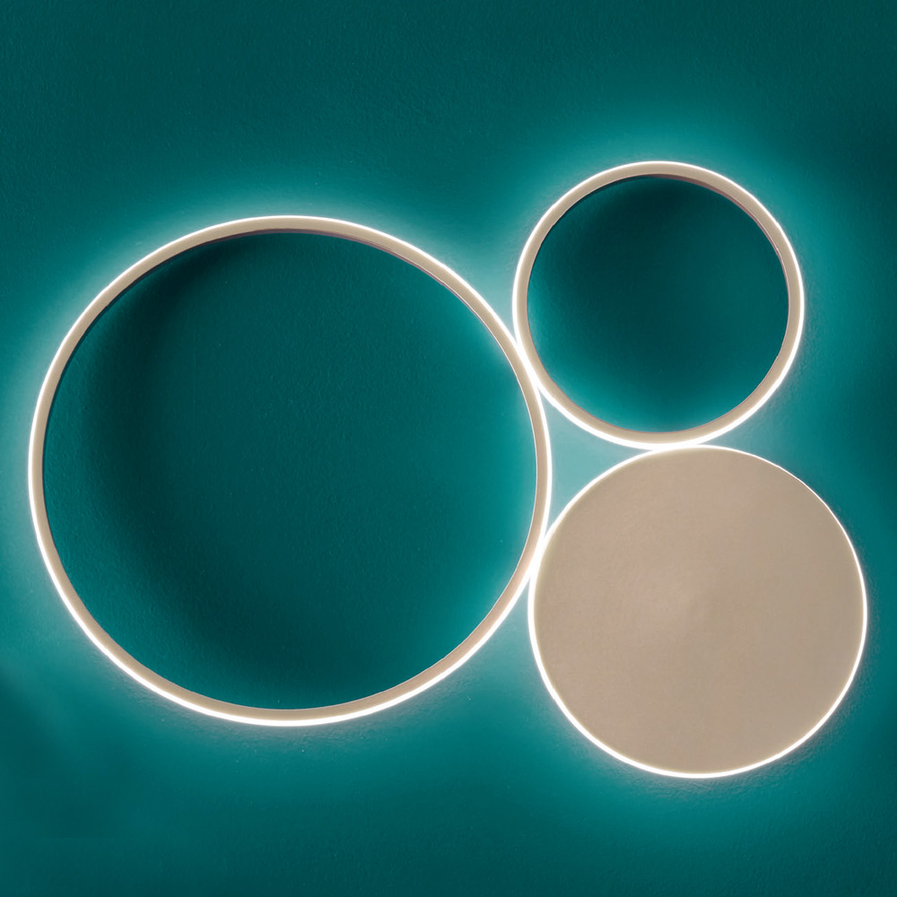en mångsidig karaktär , som kan installeras i alla hemmiljöer: entré, kök, vardagsrum, sovrum. En original komposition som består av cirklar av olika storlekar sammanfogade och täckta på utsidan av en mjölkvit diffusor som omsluter led-remsan, vilket skapar underbara ljuseffekter på väggarna för ett resultat med en