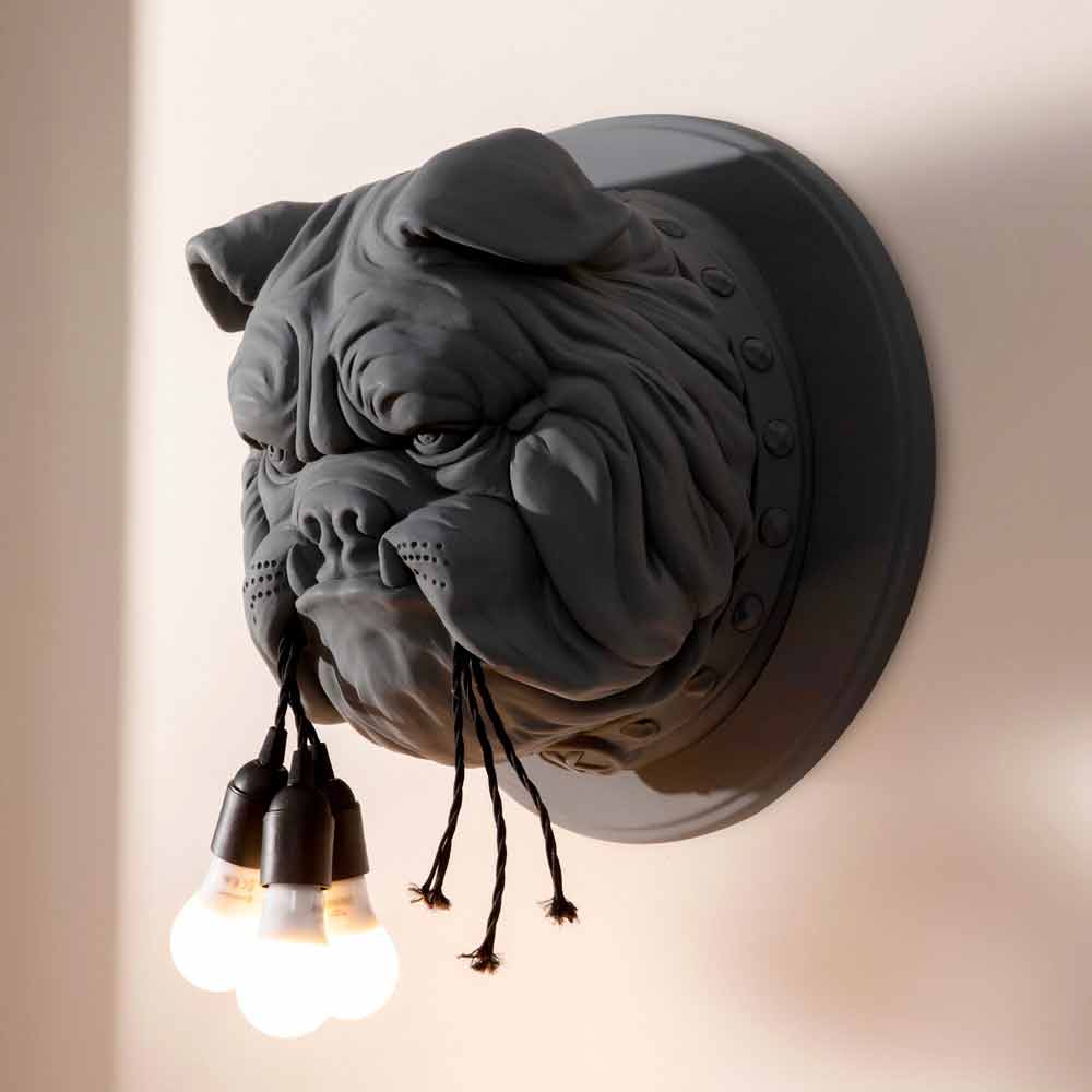 Vägglampa med 3 lampor i vit eller grå keramik i form av en bulldog, handgjorda objekt tillverkade i Italien.