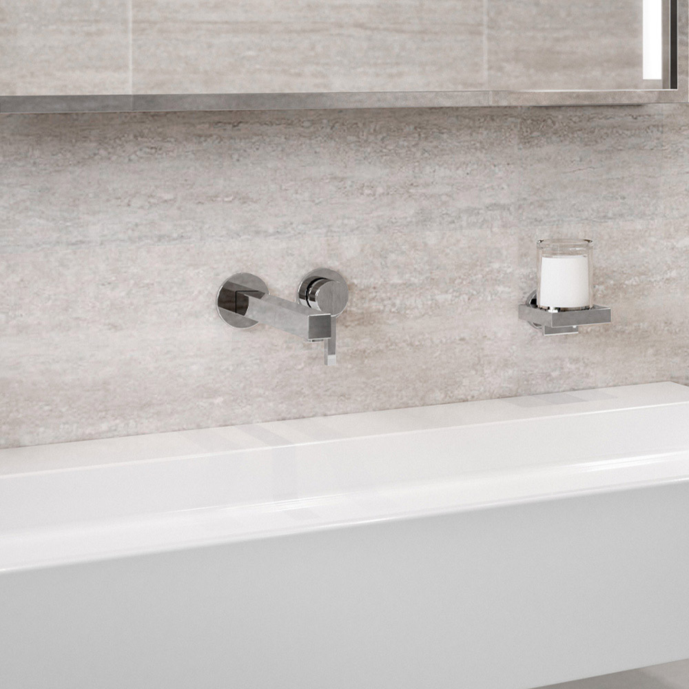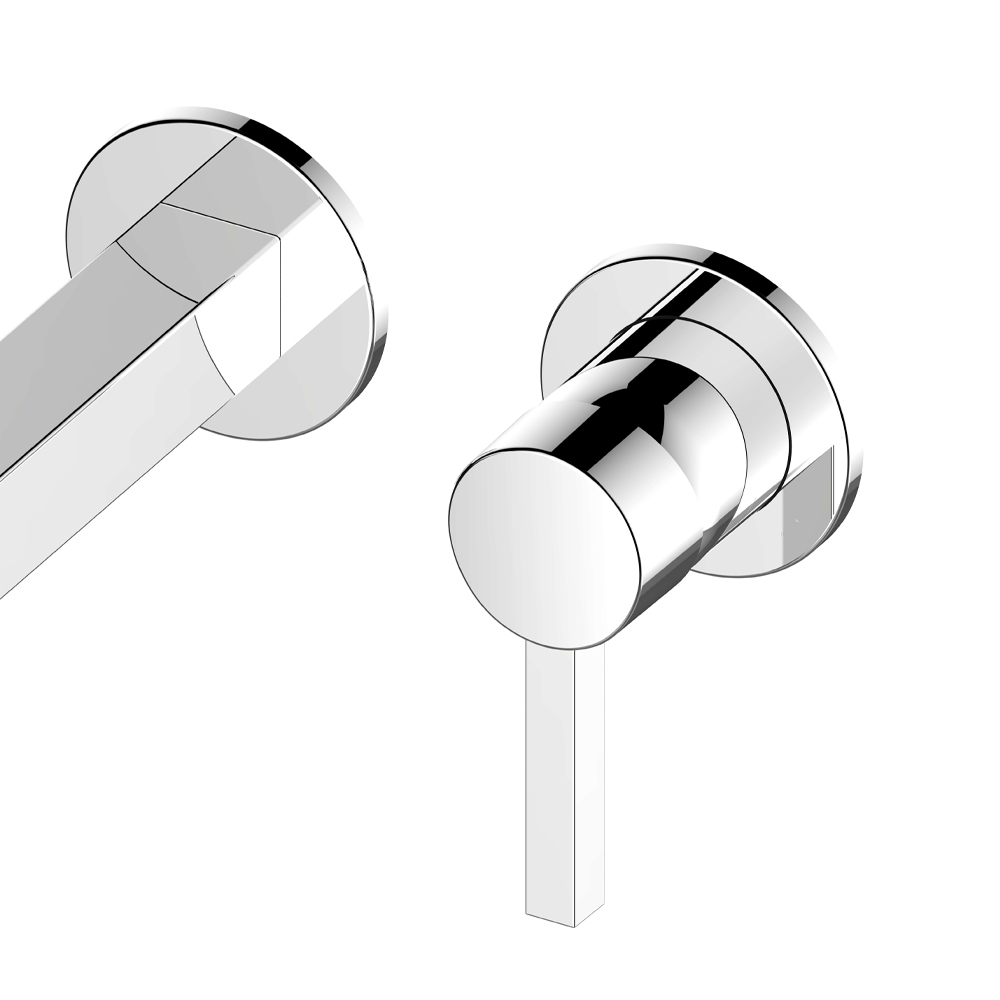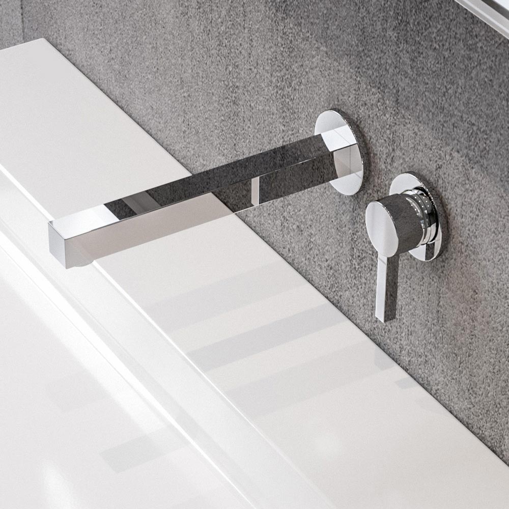 Denna väggmonterade engreppsblandare för tvättställ har en fyrkantig design på runda element. Det är en kran med rena och väsentliga geometriska linjergjord av kromad mässing med högkvalitativa material.