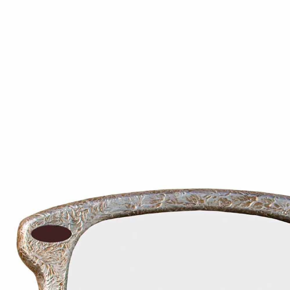 Spegel präglad av stor stil och elegans. Tillverkad av MDF, ett mycket motståndskraftigt och oföränderlig material över tiden, med formad struktur och handdierad med silverlöv på texturerat materialarbete, behagligt att hålla kontakten och trevligt att se.