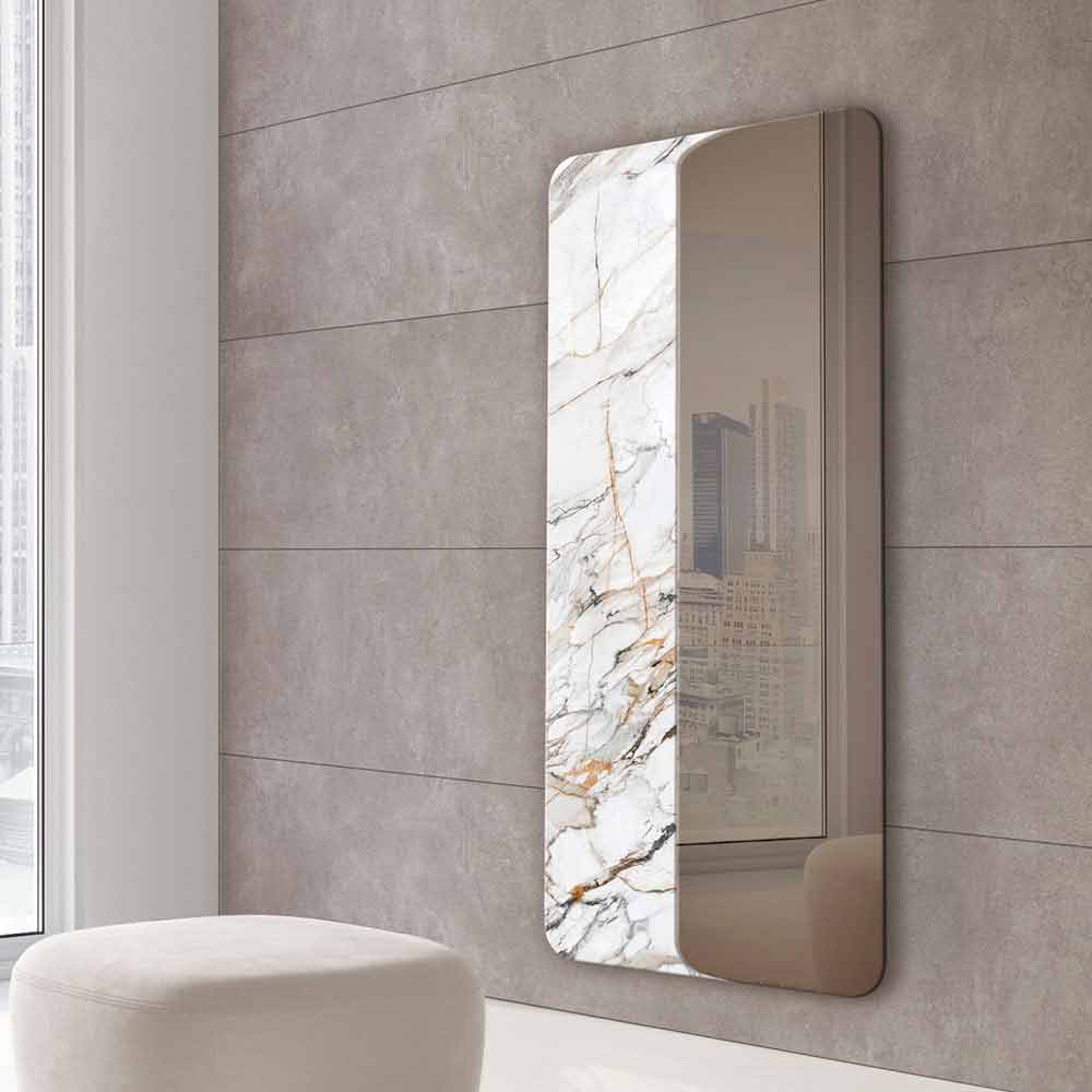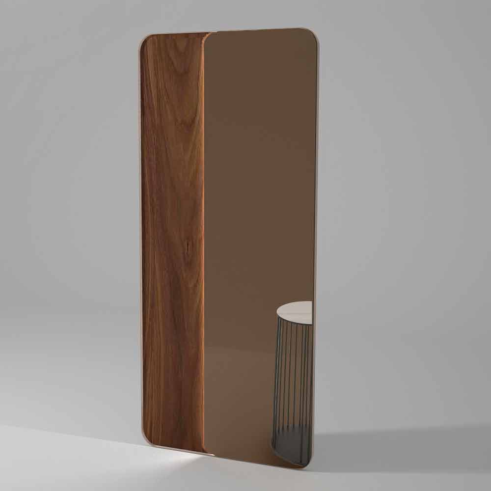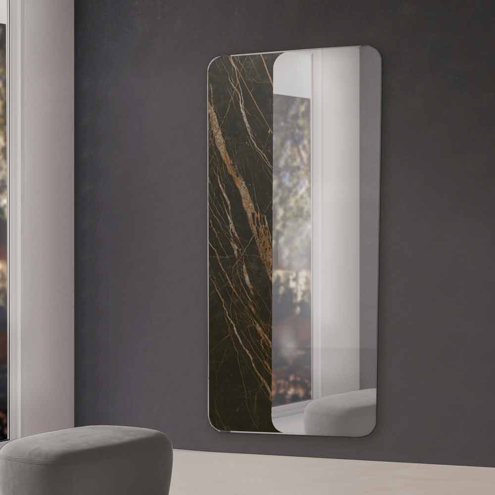 Väggspegel helt tillverkad i Italien bestående av en yttre ring i metall och en sidoinsats i keramik eller trä kompletterad med en spegel belagd i brons- eller silverfinish. En