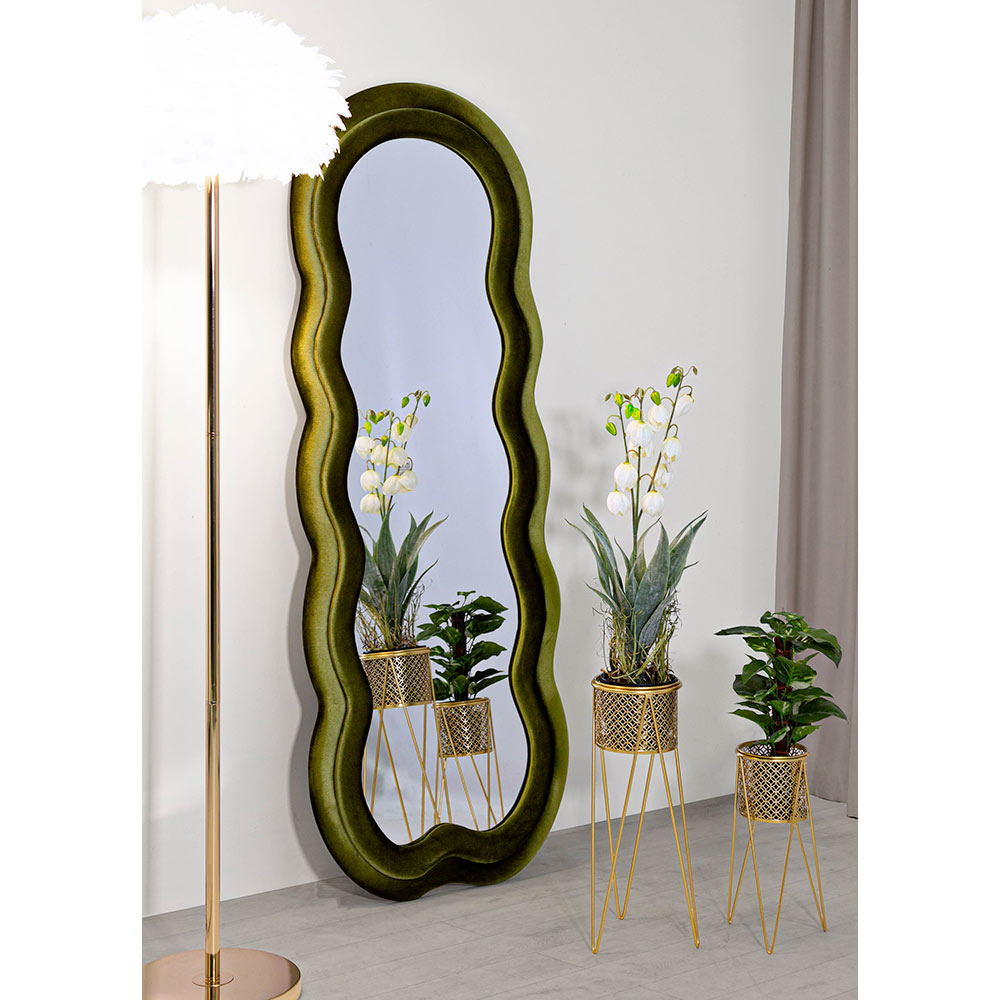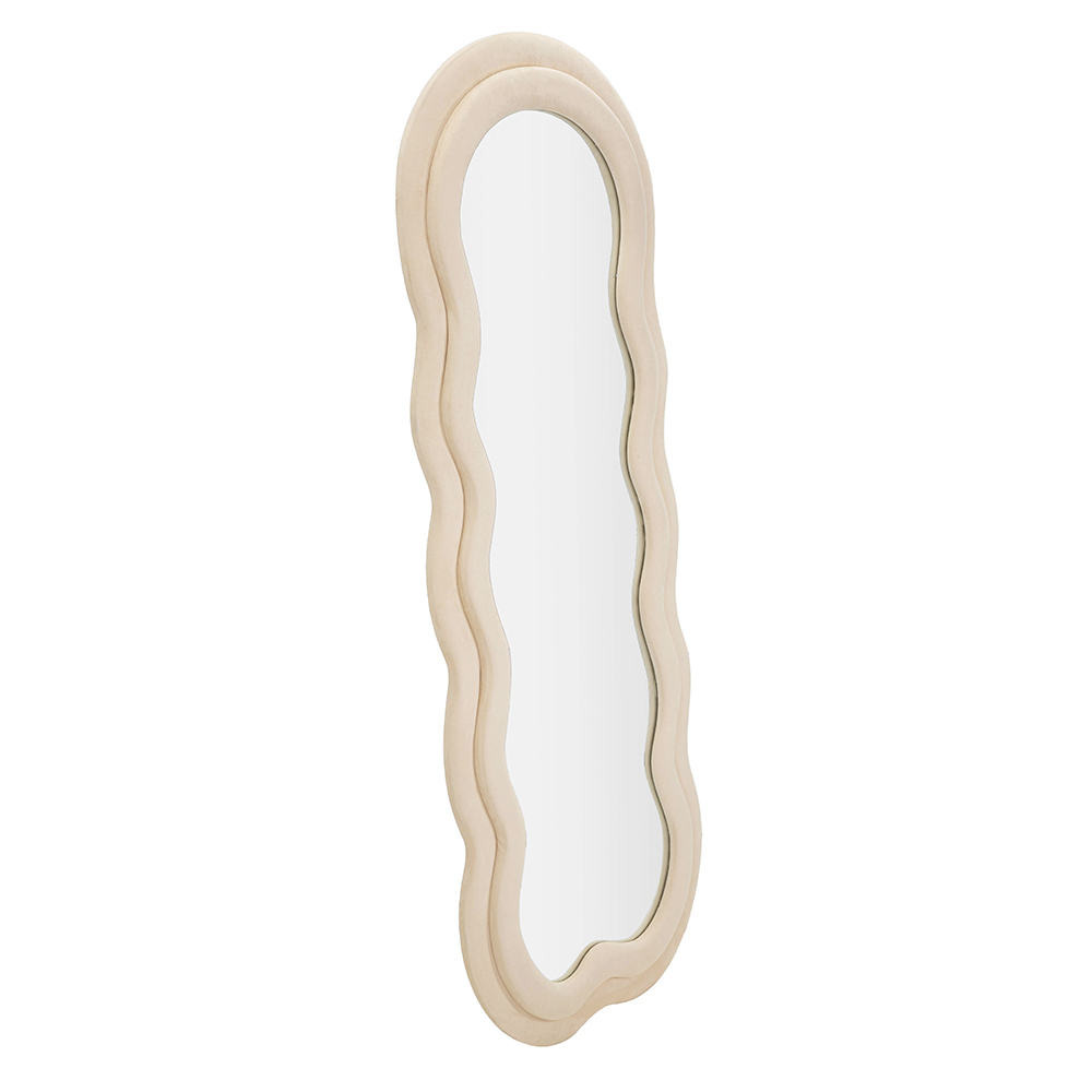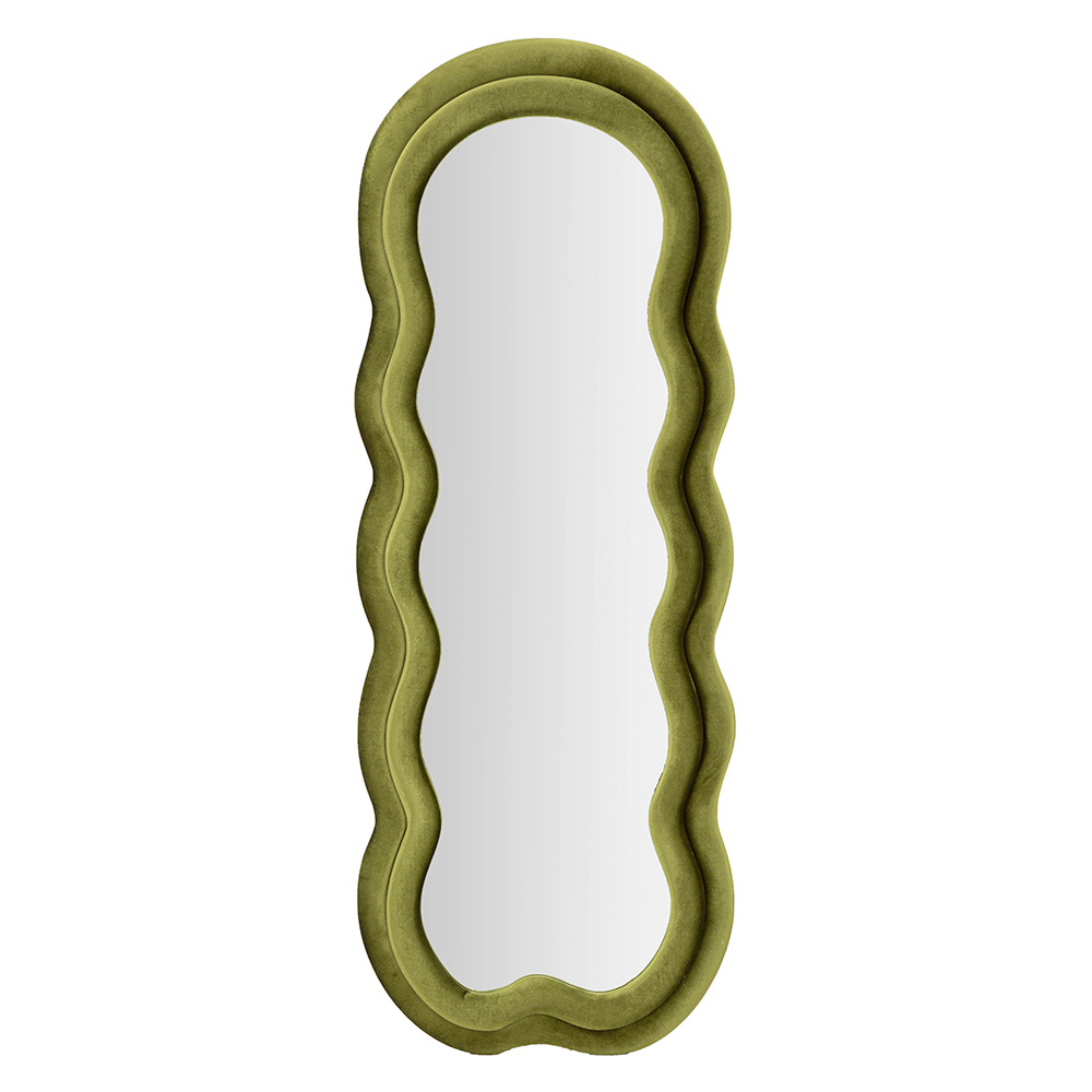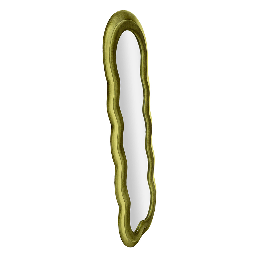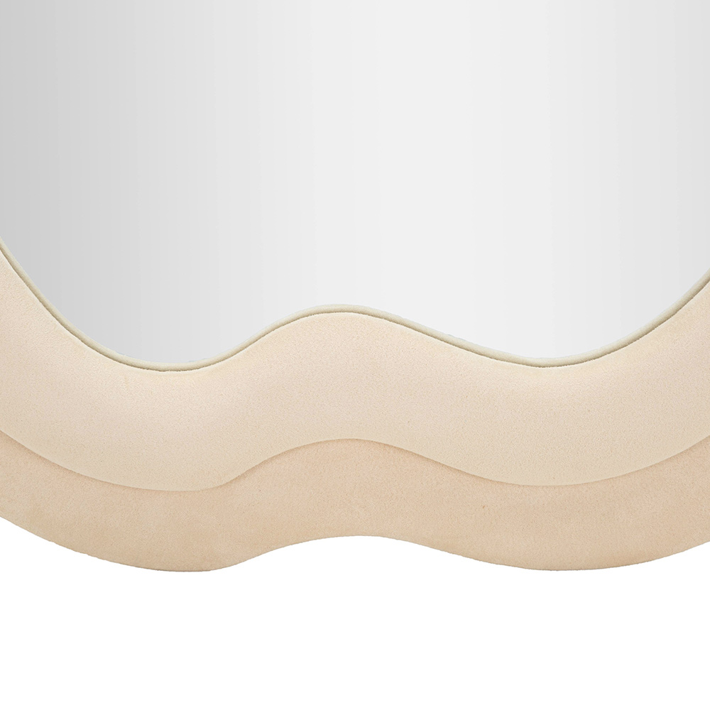 Denna dekorativa spegel är ett sublimt exempel på hur möbler kan kombinera funktionalitet och konstnärlig skönhet . Med sin vågiga ram och slingrande linjer talar detta stycke ett språk av flytande elegans och modern design . Sammetsfinishen förstärker dess organiska form, vilket gör den till ett perfekt komplement till färgade eller neutrala väggar, som kan harmonisera med ett brett utbud av paletter.