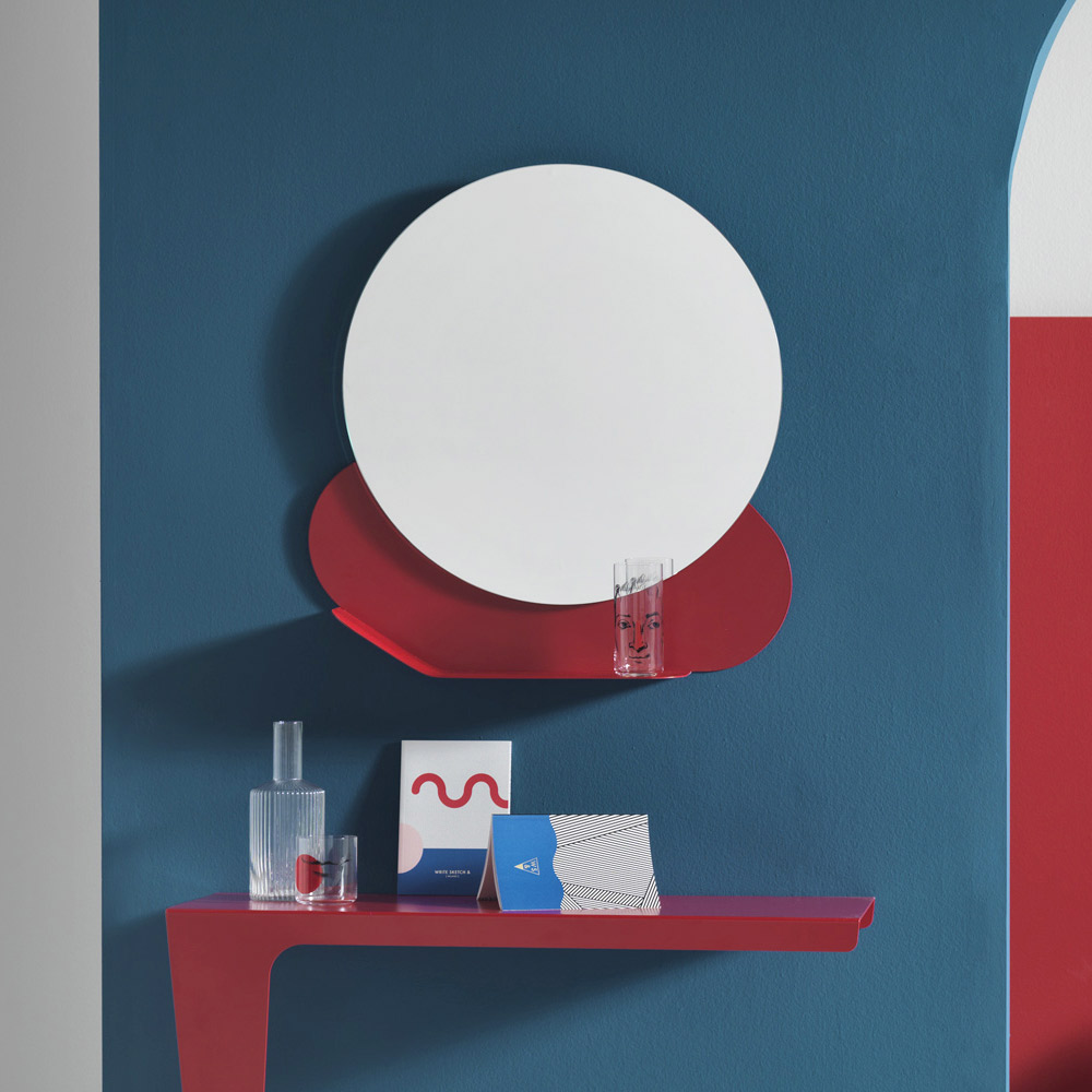 Den här moderna designade väggspegeln passar in i unga sammanhang tack vare den nedre hyllan i färgad metall med livliga och samtida färger, som avgränsar spegelns runda former och skapar kontinuitet med den omgivande miljön. En praktisk och funktionell produkt med en original och glittrande design som kan karakterisera olika sammanhang, från ingången till vardagsrummet samt i badrummet eller sovrummet.