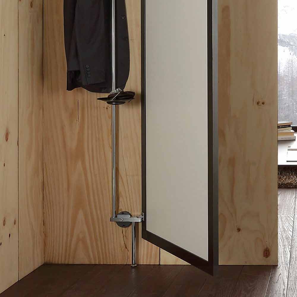 Innovativ väggspegel i rökt glas med öppning tillverkad i Italien med svartlackerad metallram komplett med förkromat metallväggsystem inklusive 3 kappkrokar och en praktisk förvaringsplatta. En extremt enkel och väsentlig design kombineras med en original och innovativ idé, vilket ger liv till en funktionell inredningslösning som kan anpassas till alla miljöer inom vilken den skapar ett dolt utrymme för att ägnas åt organisationen av olika föremål. Dess struktur är utformad för hörnytorna i huset som ofta inte används men som kan omvandlas till praktiska utrymmen där du kan placera påsar, rockar och mer, och lyckas behålla en ren och städad miljö.