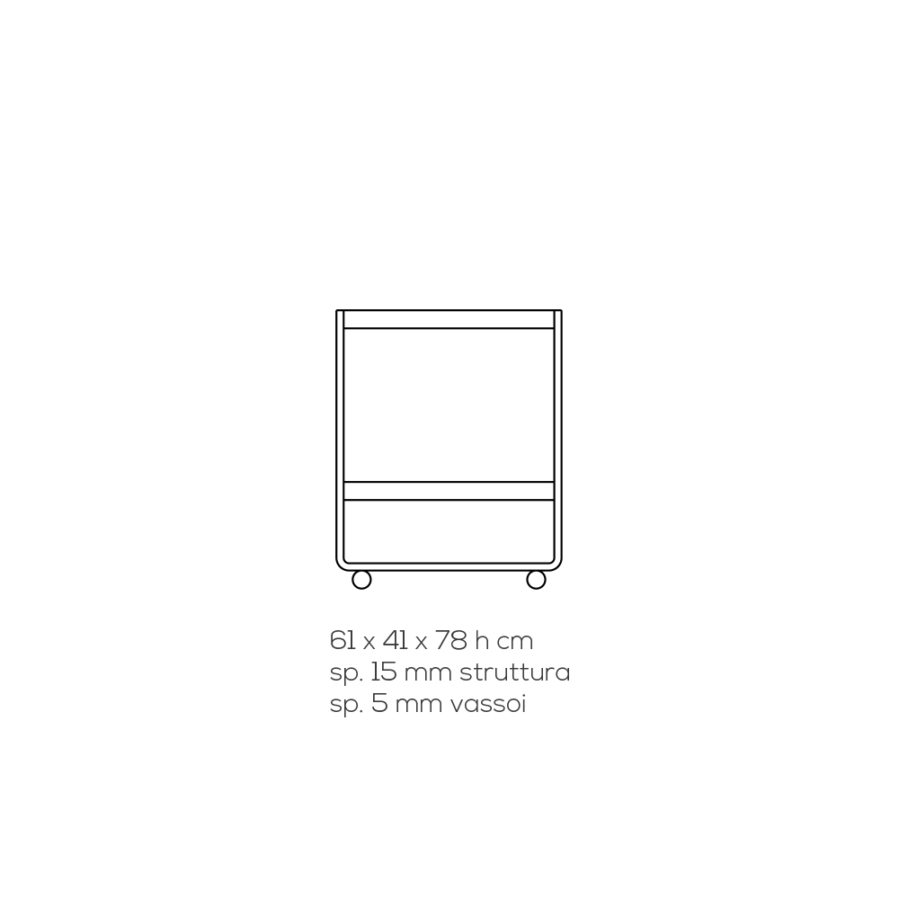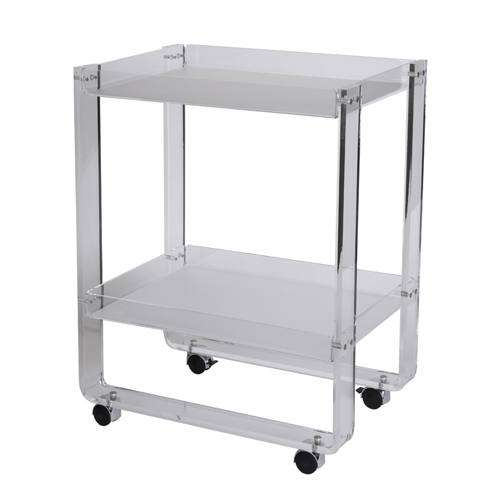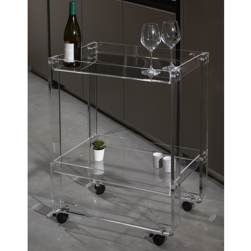 Transparent akrylkristallvagn med hjul och 2 hyllplan, tillverkad i Italien.
