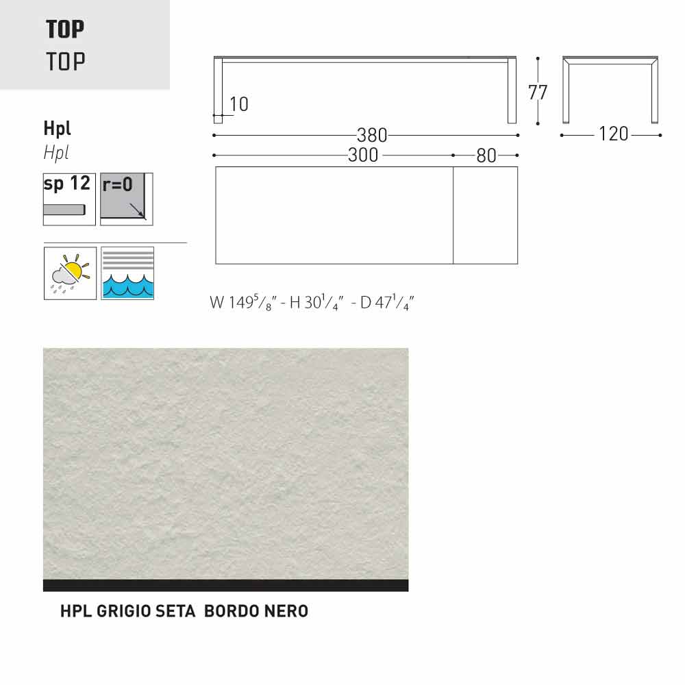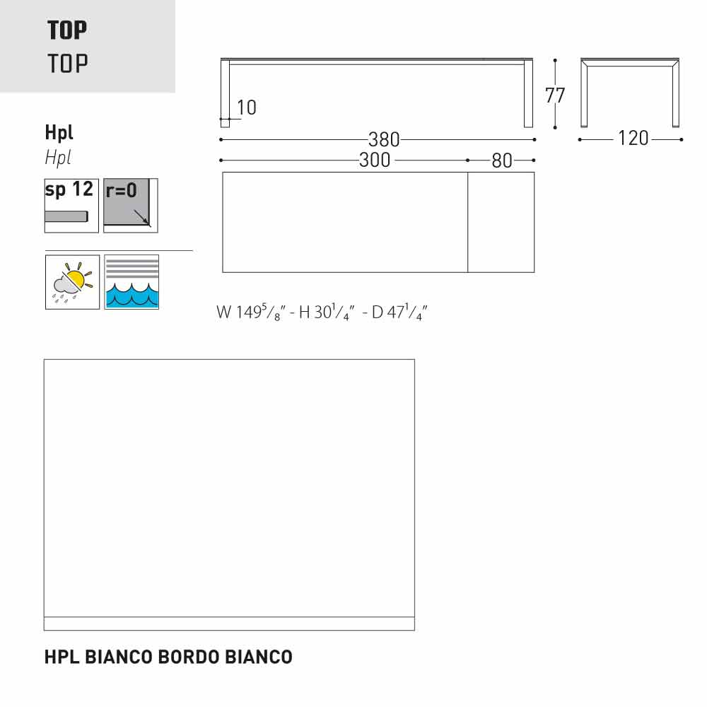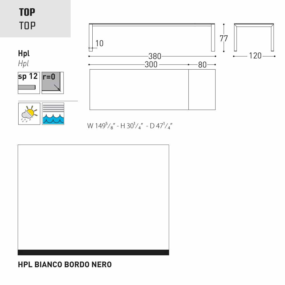 - 120 x 300/380 x H 77 cm; 1 förlängning 80 cm