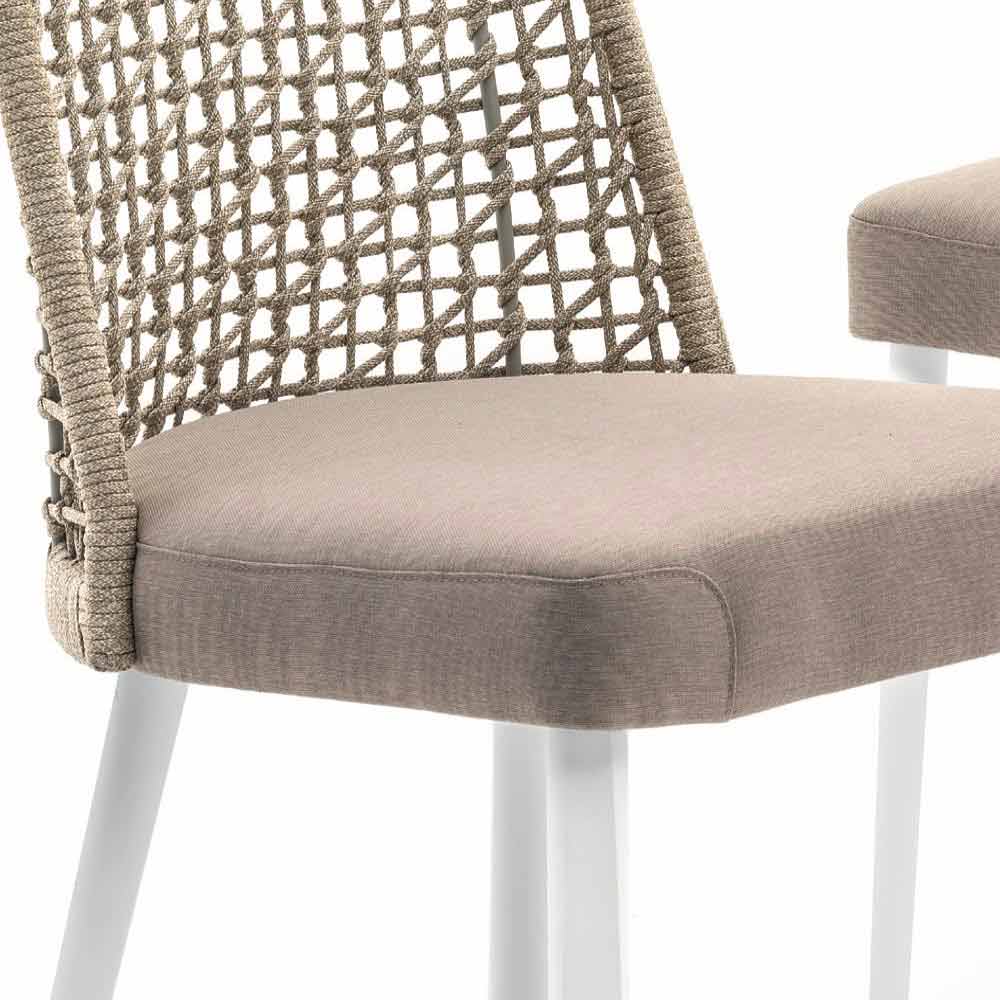 Emma är en trädgårdsstol som kännetecknas av en handvävt syntetfiberstruktur med beige pulverlackerad aluminiumram .