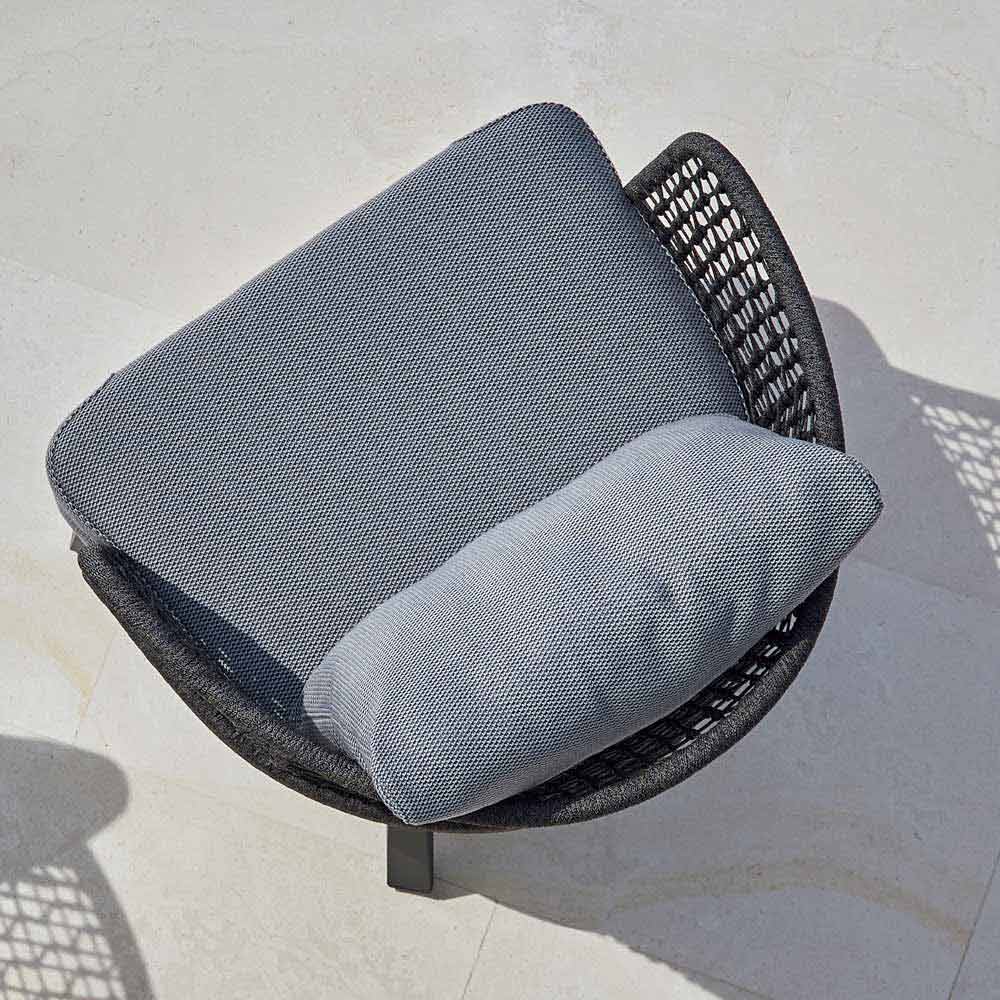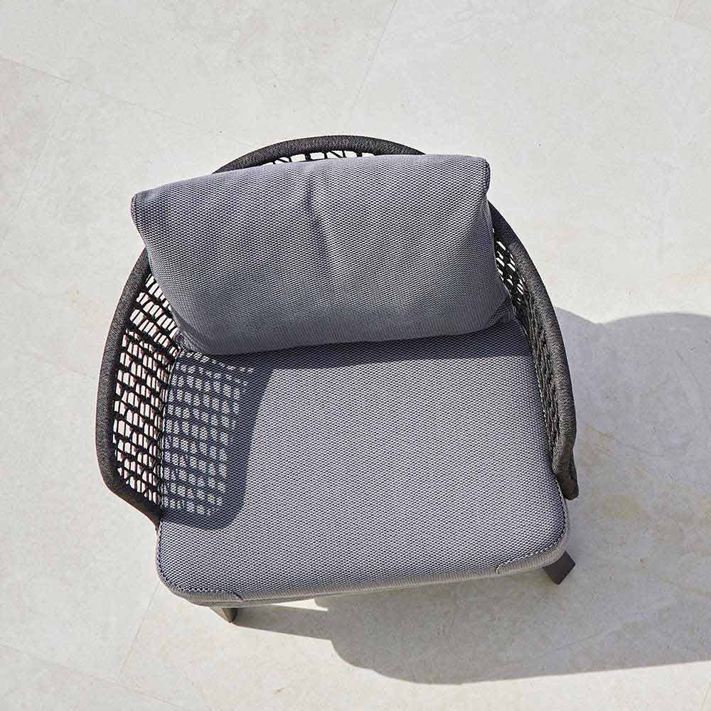 Emma är en härlig utomhusfåtölj med en struktur i handvävda syntetfibrer med en mörkgrå pulverlackerad aluminiumram .