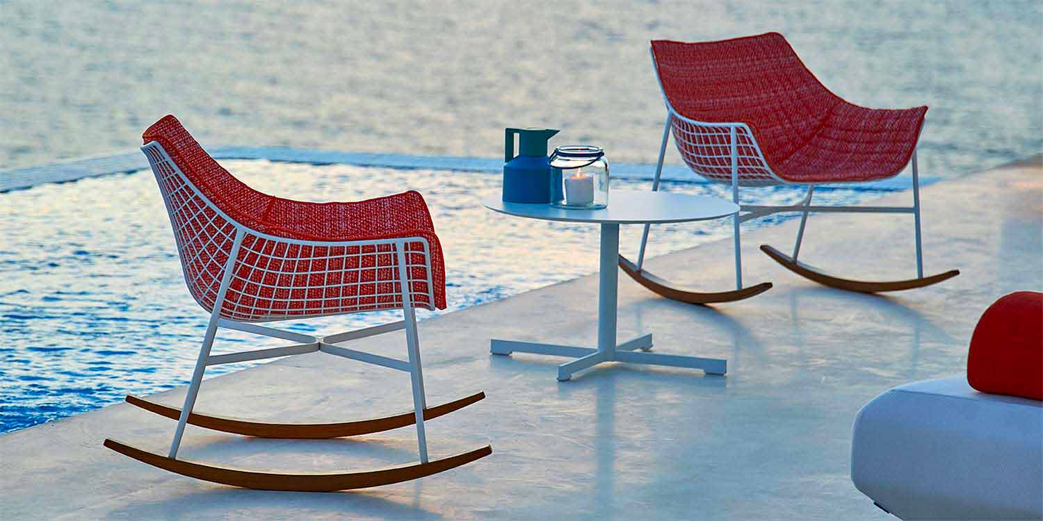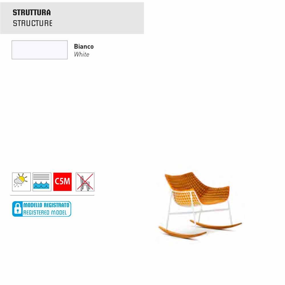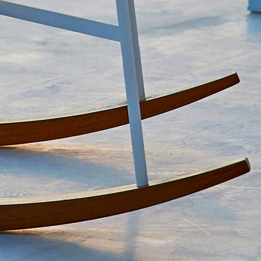 Summer Set är en härlig utomhusgungstolstol, kännetecknad av en bärande struktur i vitt pulverlackerat stål och glidbanor i naturligt iroko massivt trä.