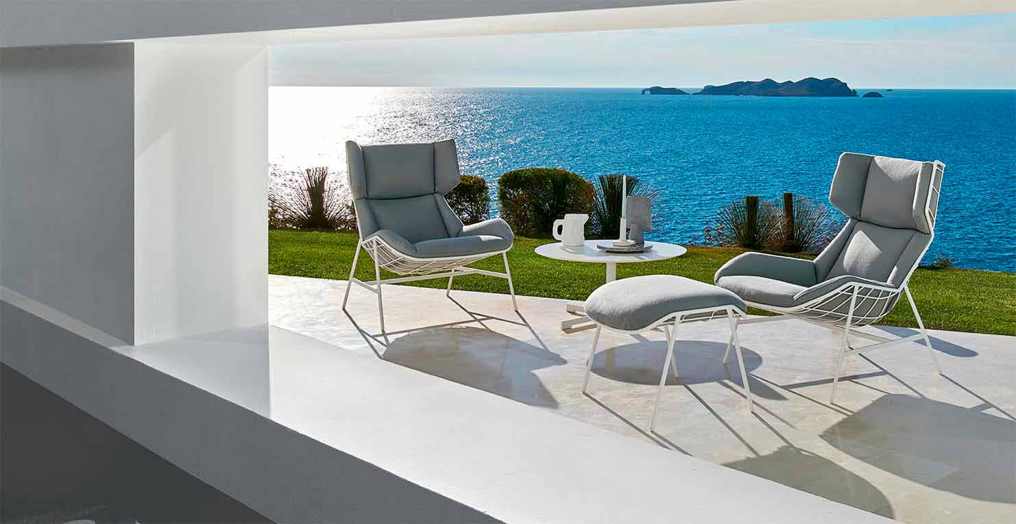 Summer Set är en underbar trädgårdspuf / fotpall, kännetecknad av en bärande struktur i pulverlackerat stål med val mellan vitt eller svart ; Sitt- och ryggkudde i tyget och vadderat med Dryfeel-gummi.