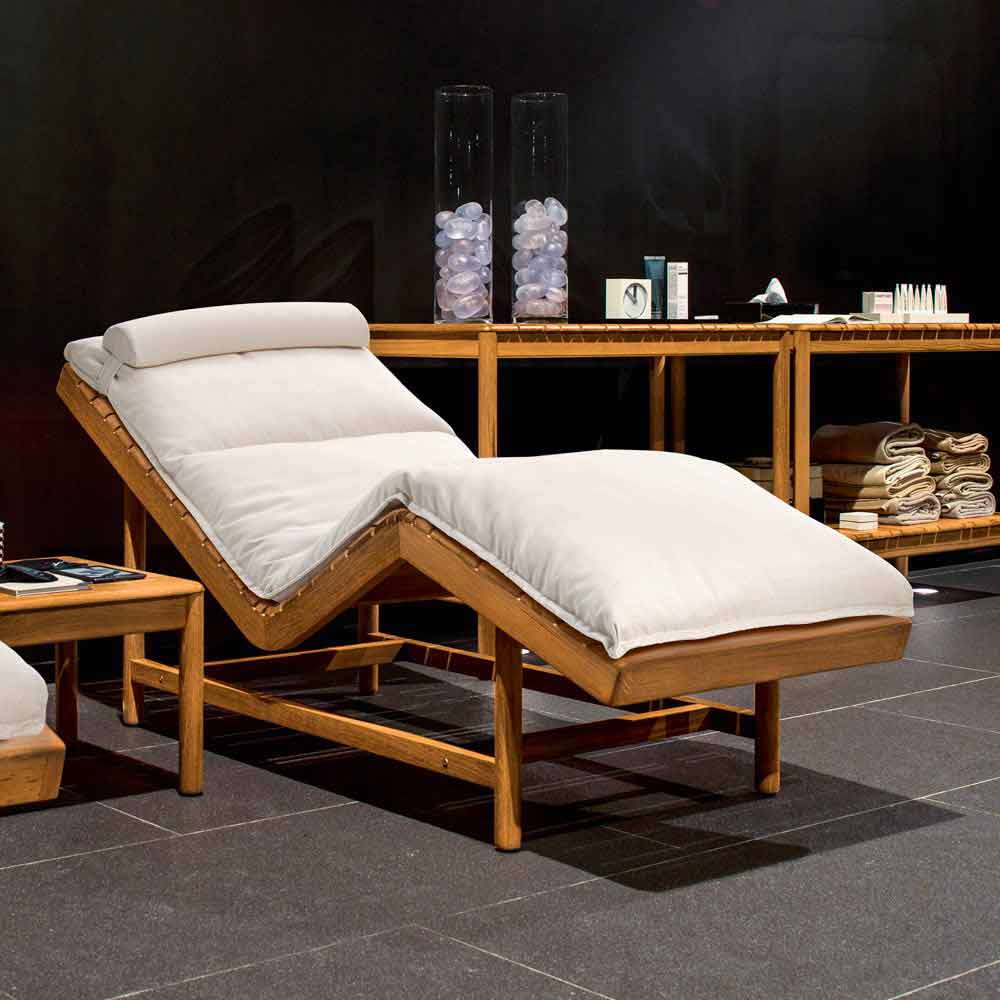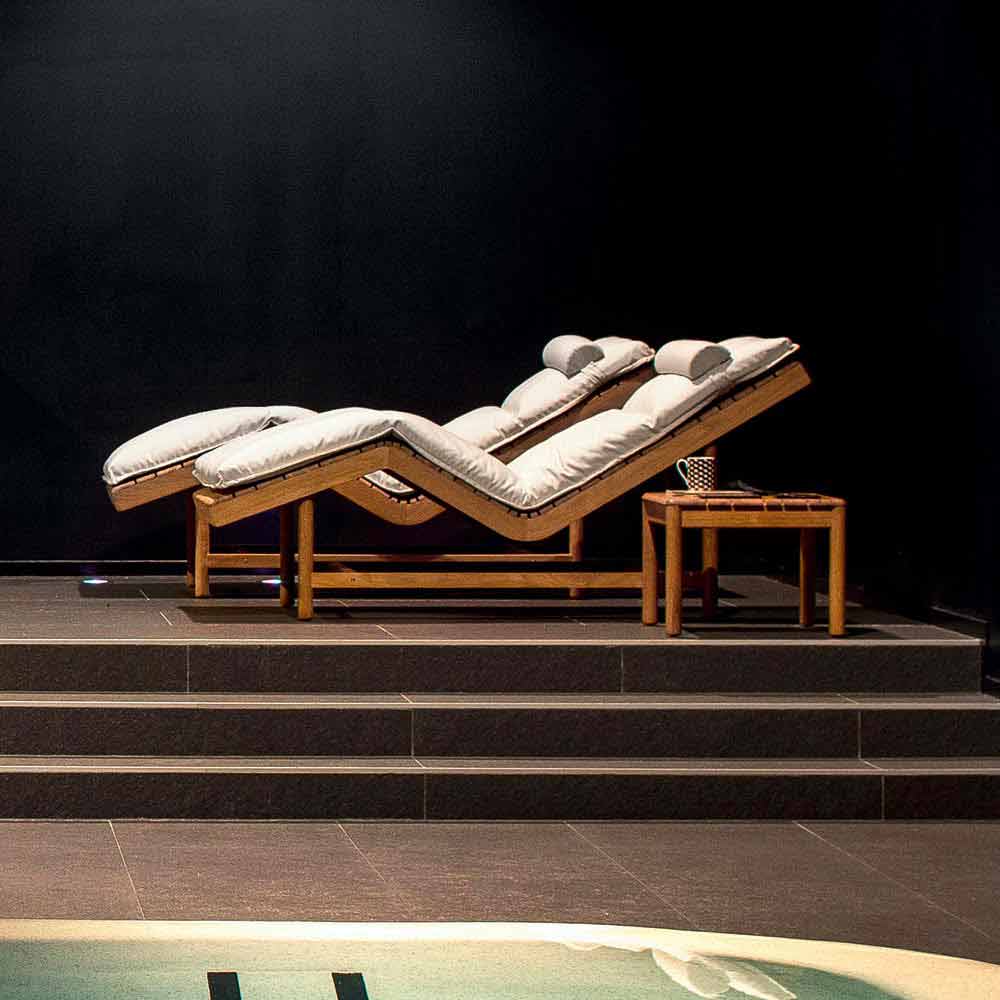 Barcode sunlounger kan användas både inomhus och utomhus och består av en teak trästruktur med en 194x70xH8 cm kudde och en 60x14xH7 cm nackstöd kudde (helt borttagbar).