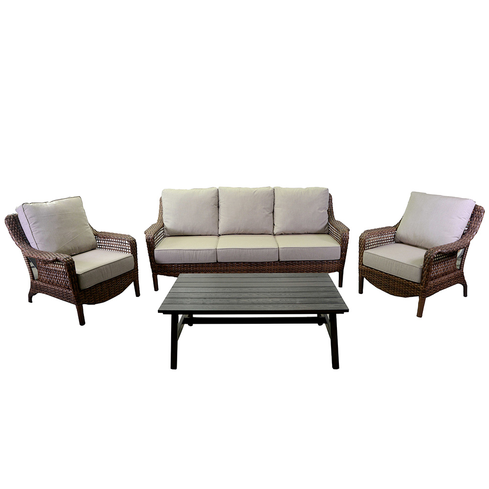Den högkvalitativa syntetiska rottingen har en brun finish som efterliknar naturlig rotting, vilket ger en touch av värme och sofistikering till din trädgård eller uteplats. De krämfärgade tygkuddarna är inte bara stiliga utan också bekväma, perfekta för långa avkopplande sessioner med familj och vänner.