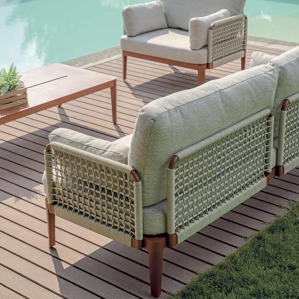 Utvändigt vardagsrum tillverkat av aluminium, rep och tyg