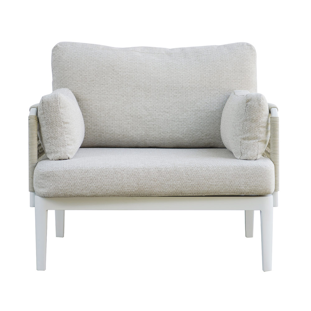 . 2 fåtöljer: aluminiumram, rygg och armar i rep, dynor i avtagbart tyg