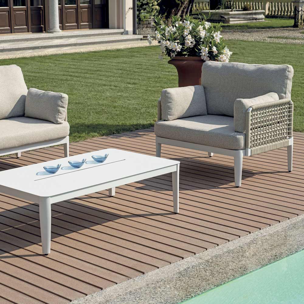 Vardagsrum bestående av 2 fåtöljer, 1 soffa och soffbord i aluminium - Symphony