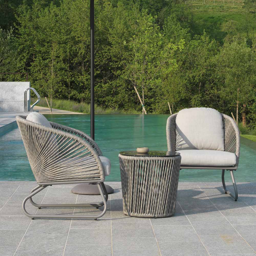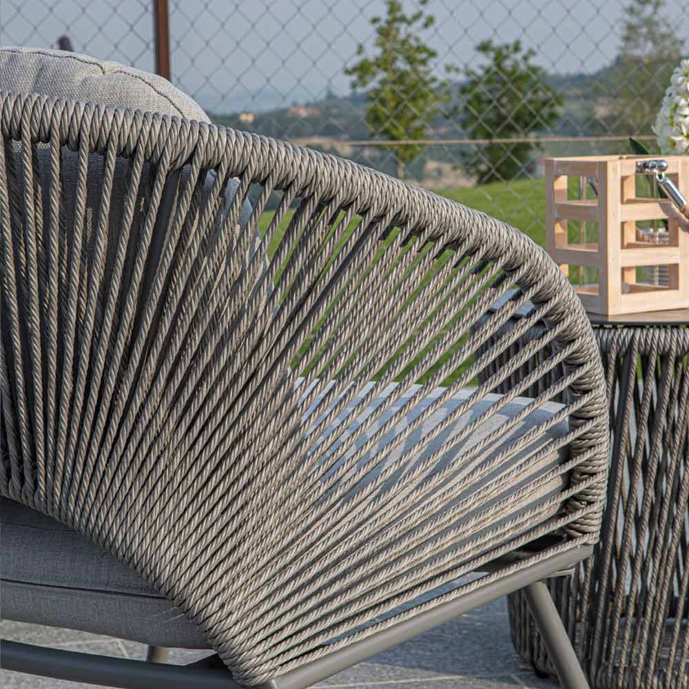 Upptäck charmen och komforten i vårt vardagsrum, en perfekt blandning av stil och funktionalitet för ditt utomhusutrymme. fåtöljerna erbjuder överlägsen komfort med sina vadderade dynor i grå nyanser, perfekt för långa stunder av avkoppling under solen eller under stjärnorna.