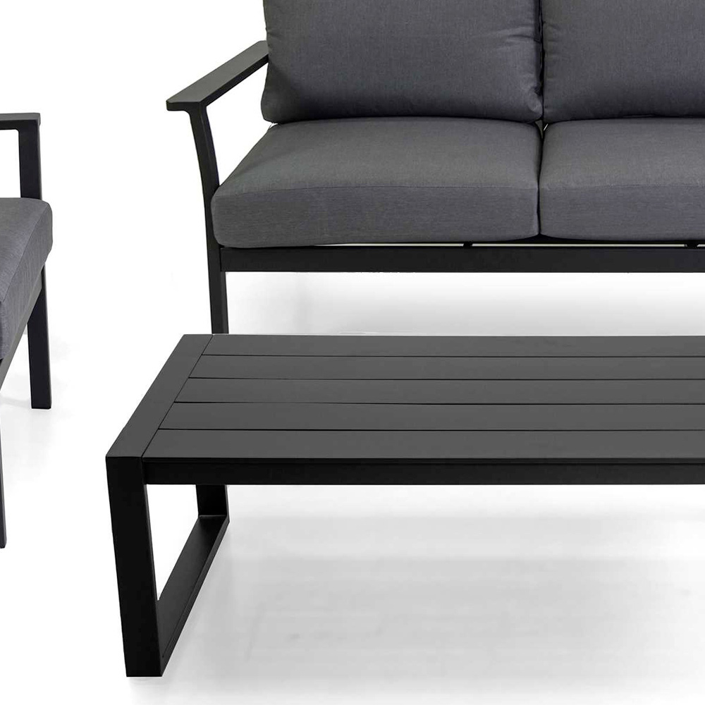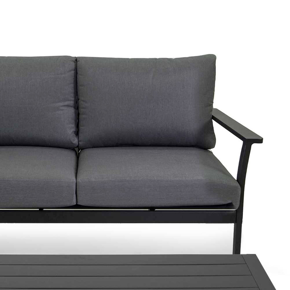 Setet innehåller en tvåsitssoffa, två fåtöljer och ett soffbord, perfekt för att skapa en mysig samtalsplats. De tjocka kuddarna ger överlägsen komfort och inbjuder till långa avkopplande eftermiddagar eller mysiga kvällar utomhus.