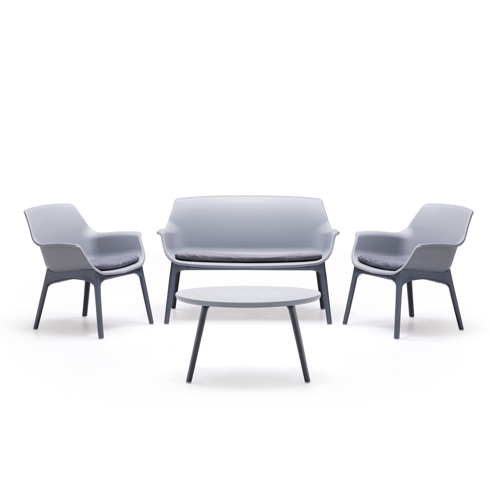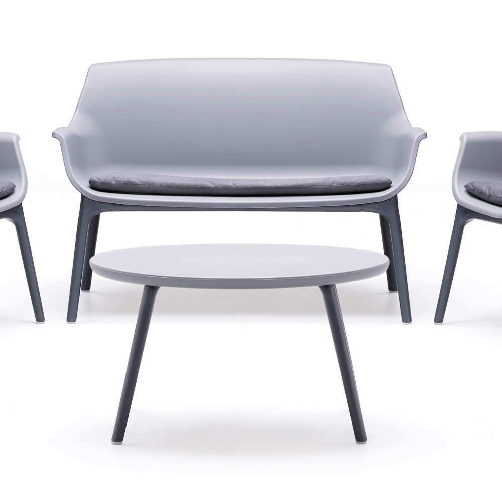 Centralbordet , även det i polypropen, är perfekt för att hålla drycker, böcker eller ett elegant blomsterarrangemang. Den neutrala färgpaletten och sofistikerade strukturen anpassar sig harmoniskt till alla utomhusmiljöer, från den moderna trädgården till den urbana terrassen.