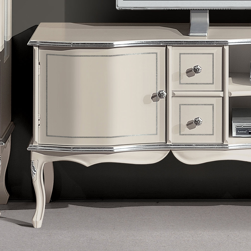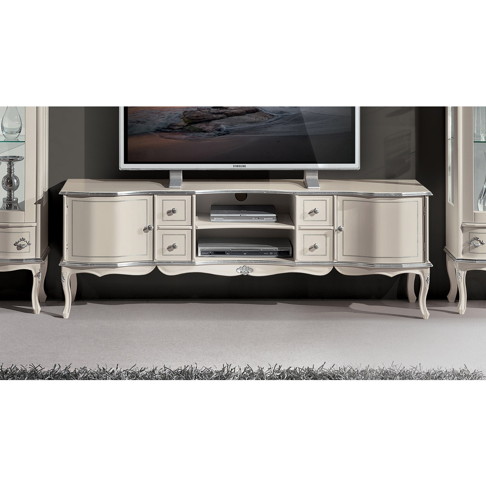 TV-bänk i klassisk stil för vardagsrummet med 2 dörrar, 4 lådor och 2 fack. Stilen och hantverket som kännetecknar hantverket framträder i denna överdådiga möbel tillverkad av fint vitt trä med silverdetaljer , ett raffinerat tillbehör som kan förhöja miljön den placeras i. Helt tillverkad i Italien och handgjord av skickliga hantverkare , är den färdigställd med skicklighet och en smak för elegans. Produktionen utförs med kvalitetsmaterial , och hantverket utförs för hand med den största omsorg och professionalism som kännetecknar Made in Italy -produkter.