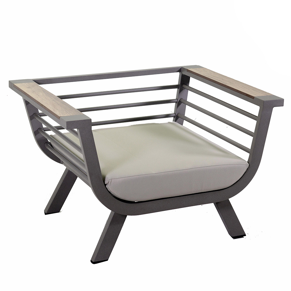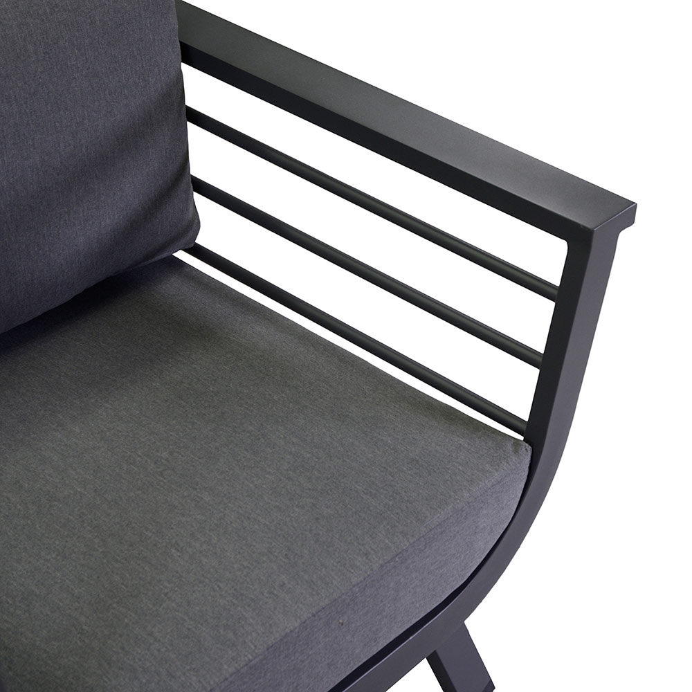 Den moderna designen på stolarna med eleganta armstöd och aluminiumets robusthet garanterar hållbarhet och stabilitet, vilket gör denna lounge till ett perfekt val för att njuta av otaliga stunder utomhus.